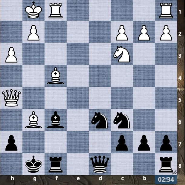 Se tendría que jugar la única 20... Rh7 donde las blancas obtienen ventaja Con Axg7 seguido de Cf6+. Esta posible variante era muy difícil de ver en la partida por toda la presión existente en un match. @Samostically jugó la humana 20. Dg3 y con esto las aguas siguen turbulentas, pero las negras tienen más chances. Siguió 20... Cf5 21. Db3 para seguir con la presión, pero las negras encuentran una ruta ventajosa.