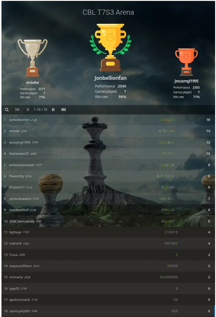 The third season is coming to an end. Last Sunday we had round number 7, which leaves us only one match to finish the season "Master Sacrifice". This round was quite concentrated, as 18 players were present, a figure that differs from previous rounds in terms of participation, but in terms of ranking it was one of the strongest that have been played. Let's see the final standings.