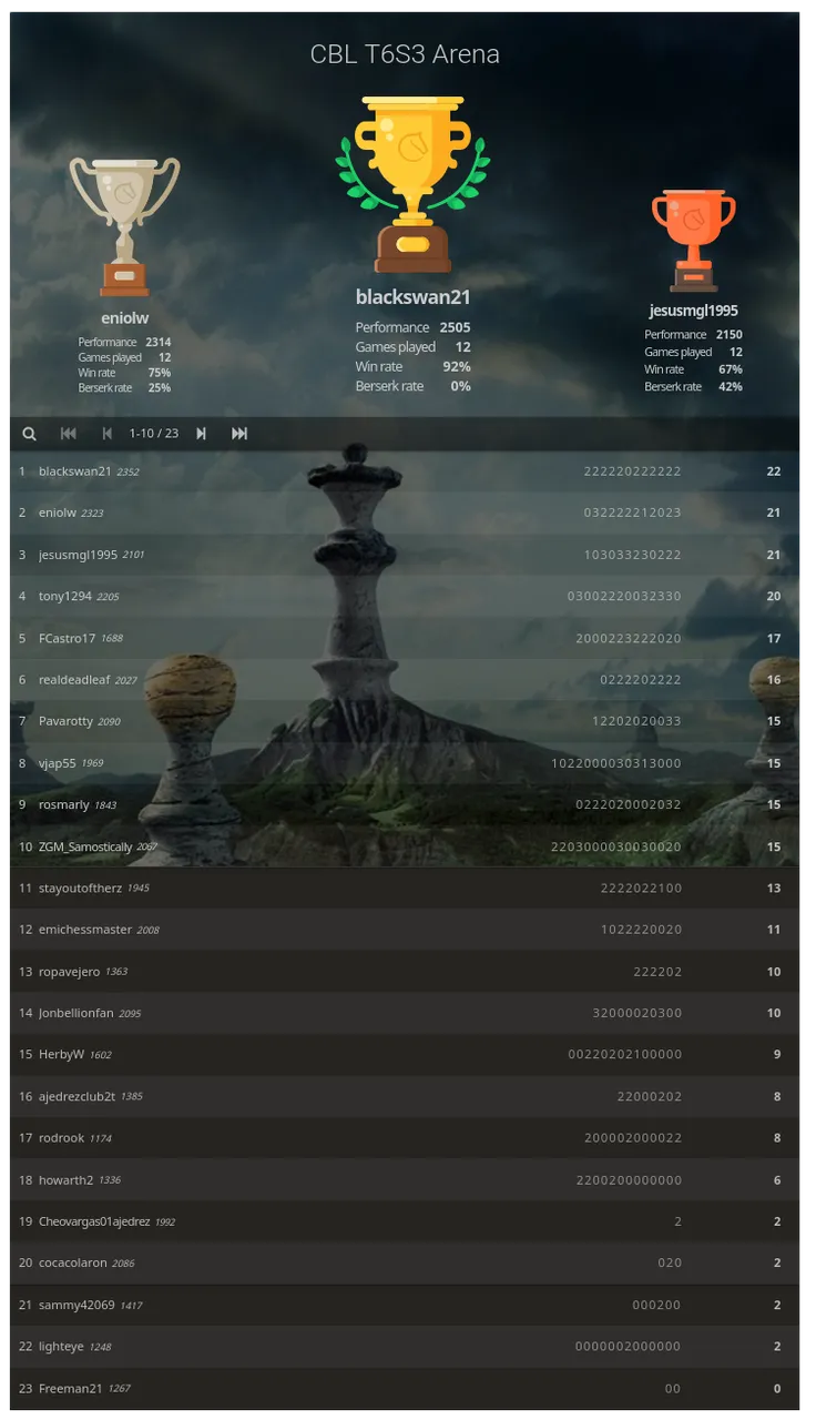 Players making their debut in the season: 3 (Cheovargas01ajedrez, Freeman21, @jesusmgl1995).