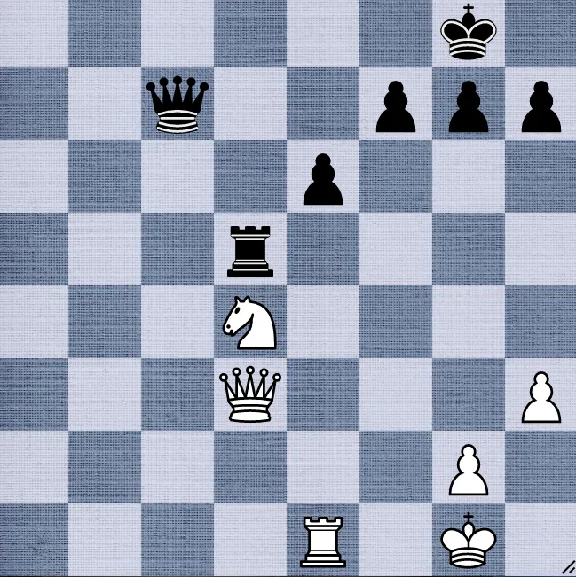 La estrategia de @tony1294 funciona temporalmente. Las negras dan jaque en b6 con la dama y las blancas dejan pasar el momento de oro, pues podían retroceder el caballo a d4 y de esta manera quedaría protegido activamente, pues al finalizar los cambios darían mate en la ultima fila con su torre. Sin embargo, ambos jugadores estaban escasos de tiempo y la cosas se salieron de control. Se llegó a una posición totalmente igualada y las negras cedieron tras unos cuantos blunders producto del tremendo apuro.
