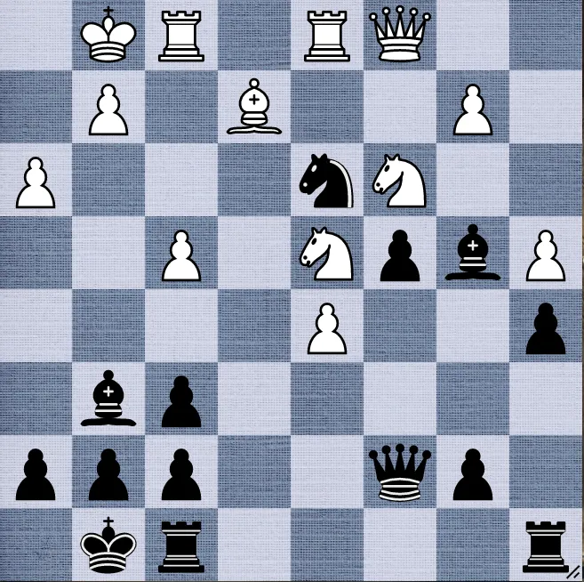 Las negras han movilizado sus fuerzas de manera tal que han invadido las filas enemigas. La presión en el centro se hace notar con gran fuerza y el flanco dama está totalemte militarizado por el segundo jugador. En efecto, la posición que se muestra es un claro ejemplo de explotación de los temas tácticos en combinación con las amenazas.