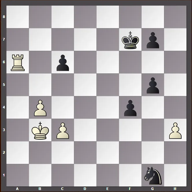 The game continued with 2... f3 3. Rc7+ Kg6 4. Rc8 trying to control the pawn from behind, but it's too late. After 4...Nxh3 5.Rf8 Nf5, the trusty knight obstructs the rook's action and with this Black promotes and wins.