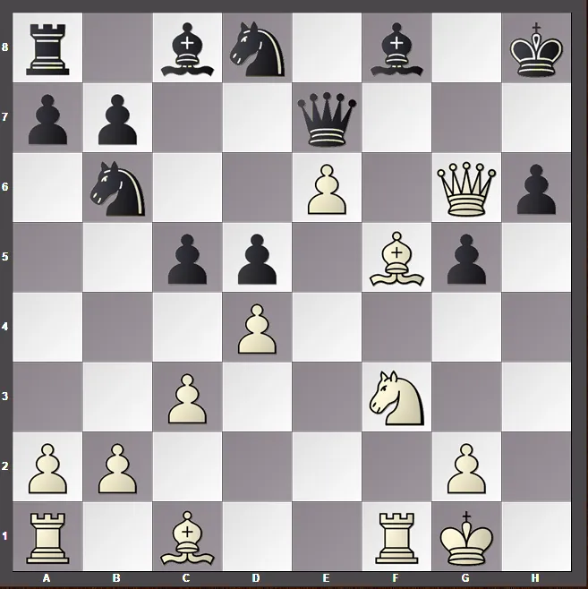 La jugadora perpz una WFM (maestra de la FIDE femenina, siglas en inglés) con bastante experiencia. Aquí nos demuestra cómo se remata una partida y ¡vaya manera de hacerlo! Su posición es dominante, por lo que los mótivos tácticos florecen y están a su disposición. Ahora mismo juega 22. Nxg5! y la fortaleza de las negras se desmorona con este sacrificio de caballo. Siguió 22... hxg5 23. Axg5 y las negras no tienen más remedio que inclinar su rey, pues no hay defensa.