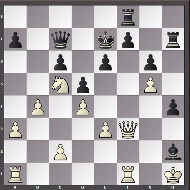 La partida continuó con 2... f3 3. Tc7+ Rg6 4. Tc8 tratando de controlar el peón por la retaguardia, pero es muy tarde. Tras 4... Cxh3 5. Tf8 Cf5, el fiel caballo obstruye la acción de la torre y con esto las negras coronan y se imponen.