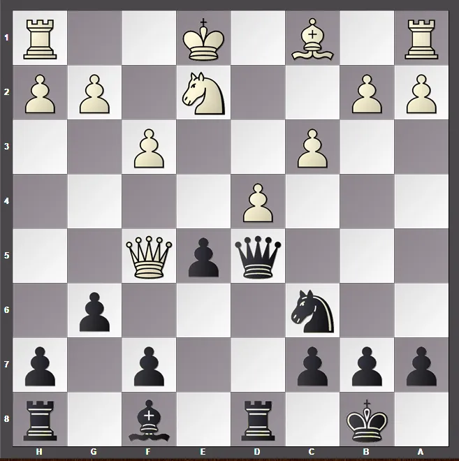 El jugador @deadleaf con buen criterio se abrió paso ante las filas enemigas empleando el sacrificio 24. Cxe6! que es mortal. Se jugó 24... fxe6 25. Dxf8 Rd7 y las blancas se llevan la gloria muy instructivamente con está extracción del rey negro. Tras 26. Tf7+ Txf7 27. Dxf7+ Rc8 28. Dxe6+ Rb7 y 29. Tf1 la posicón es insostenible. Algo importante de mencionar es que @stayoutoftherz devolvió el golpe en el siguiente enfrentamiento que tuvo contra @deadleaf, lo que ejemplifica el sentido de competitividad que hay en la liga.
