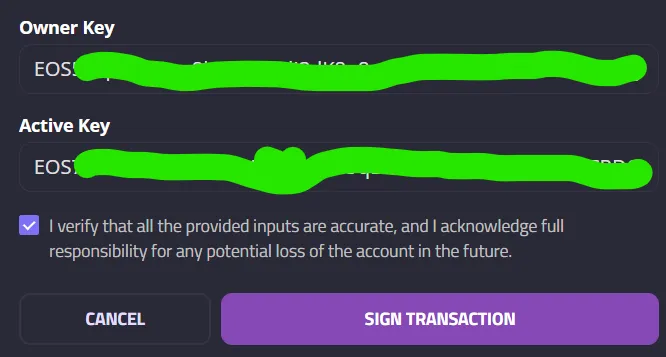 Step 6 - Enter your fresh PUBLIC keys, and Sign Transaction. Public keys start with "EOS".