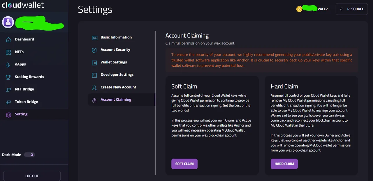 So in the settings of My Cloud Wallet, you can click the Account Claiming option. This will present you with 2 versions of claiming your account, which I love. It's not just either you have cloud wallet or you don't. There's an option for soft claiming, which I highly recommend. So I'll walk you through Soft Claiming your keys. It's actually very simple, but there's no guide that ranks on Google, so here's my shot at getting some traffic from people trying to figure out how to do this.
