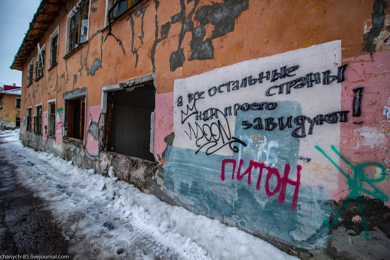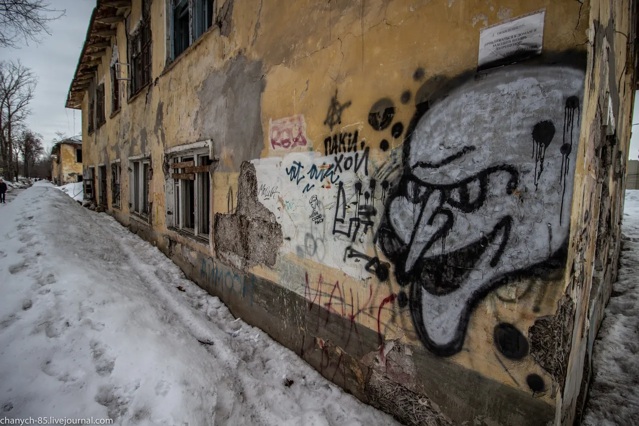 Samara, VivaLand shopping center district. Quarter settled and abandoned "Stalinok". Typical "Stalinka" two-story houses - the main housing for workers, known in many cities. Someone calls them barracks, someone is "Stalinka". These homes, built in the postwar years, have long served their time. Many of the houses in this series are recognized as emergency and resettled. But they are not demolished immediately, some buildings have been in an abandoned state for more than one year. Over time, they turn into landfills and havens for the homeless. Very often in such houses there are various emergency situations and fires. Gradually pinched by high-rise buildings, these houses stand like monuments, casting anguish and gazing out onto the street with empty sockets of the windows.