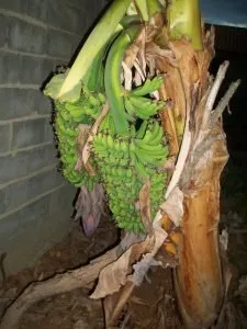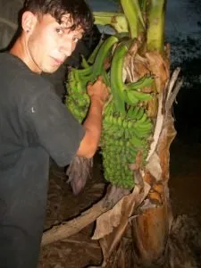 Cuando llegue al lugar, resulta ser que era una señora la dueña del área donde estaba sembrada por lo que, pedimos permiso para acceder; cuando le menciono que tomare unas fotos a la planta de cambur, ella se sorprendió y me dijo que para qué era eso. A lo que yo le comente que me habían comentado que existía una planta de cambur que arrojaba dos racimos al mismo tiempo, a lo cual ella se ríe y me dice la otra que habían cosechado tenía tres (3) racimos.