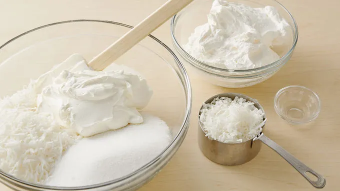 4 In medium bowl, stir together 2 cups of the coconut, the sugar and sour cream. Spoon 2 cups of the mixture into large bowl; stir in whipped topping, coconut extract and 1 cup of the remaining coconut. Set aside.