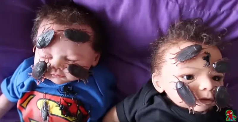 This one shows a giant tarantula crawling on a toddler in a onesie.