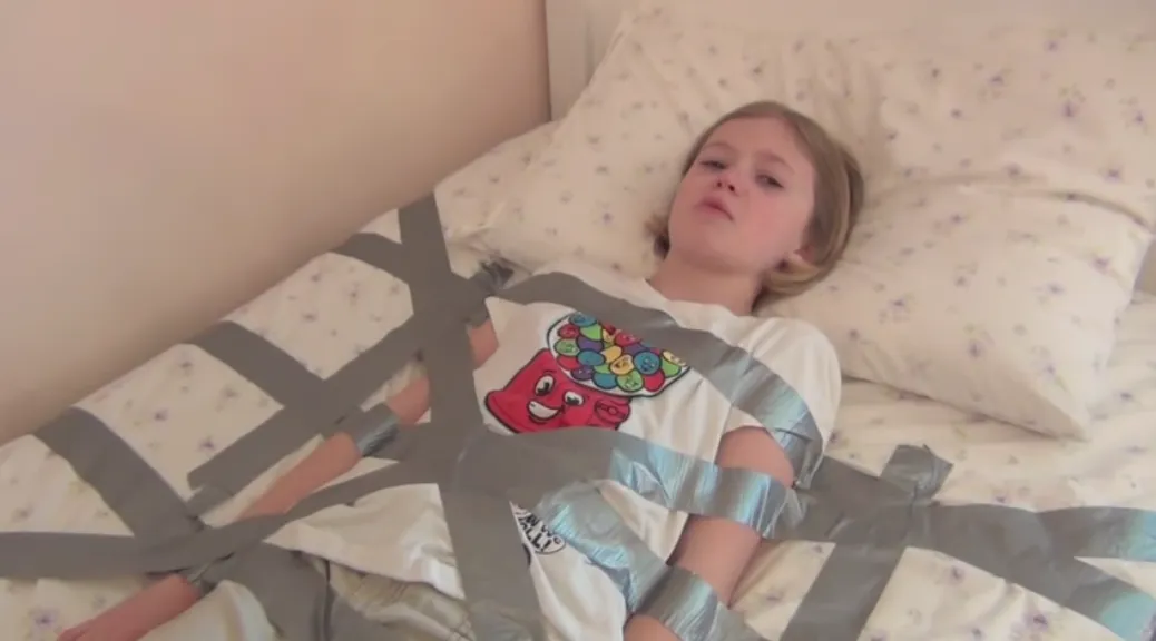 The second video is labeled “Escaping from Your Bed In The Morning!!” and features a young child immobilized on a bed with duct tape. What might be an interesting video to children is certainly a child bondage video for predators, who gorge on the fantasies elicited from the viewing.