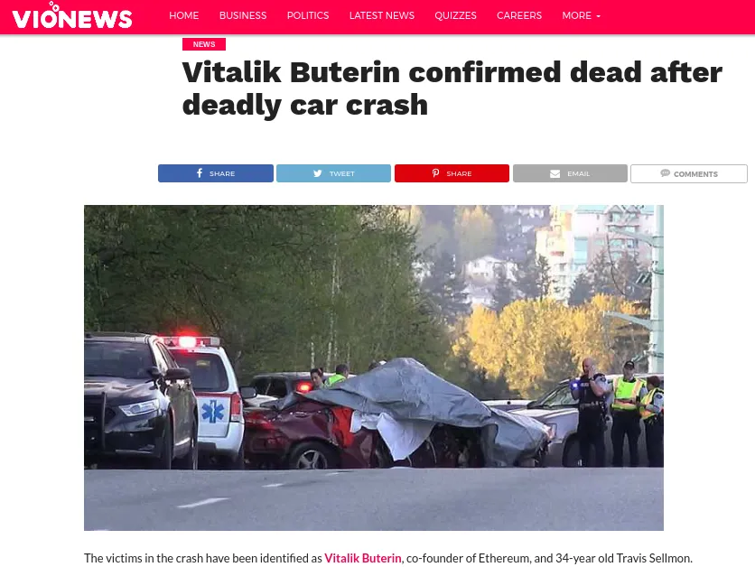 The story appears to have stemmed from fake news website Vionews, which released a now-deleted article which made references to Buterin from “Ethereum” as “confirmed” dead in a crash in British Columbia.
