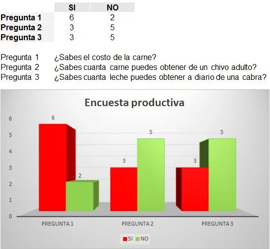 Entonces se tiene, de un universo de 8 personas encuestadas, ante la pregunta nro. 1, ¿Sabes el costo de la carne?, 6 personas conocen el precio actual de la carne, lo que representa un 75% de la población encuestada. De la pregunta nro. 2, ¿Sabes cuanta carne puedes obtener de un chivo adulto?, 3 respondieron afirmativamente para un 37,5% y 5 dijeron que no sabían para un 62,5% del total de personas encuestadas. Finalmente, en la pregunta nro. 3, ¿Sabes cuanta leche puedes obtener a diario de una cabra?, 3 respondieron que si, para un 37,5% y 5 dijeron que no sabían, para un 62,5% del total de personas encuestadas.