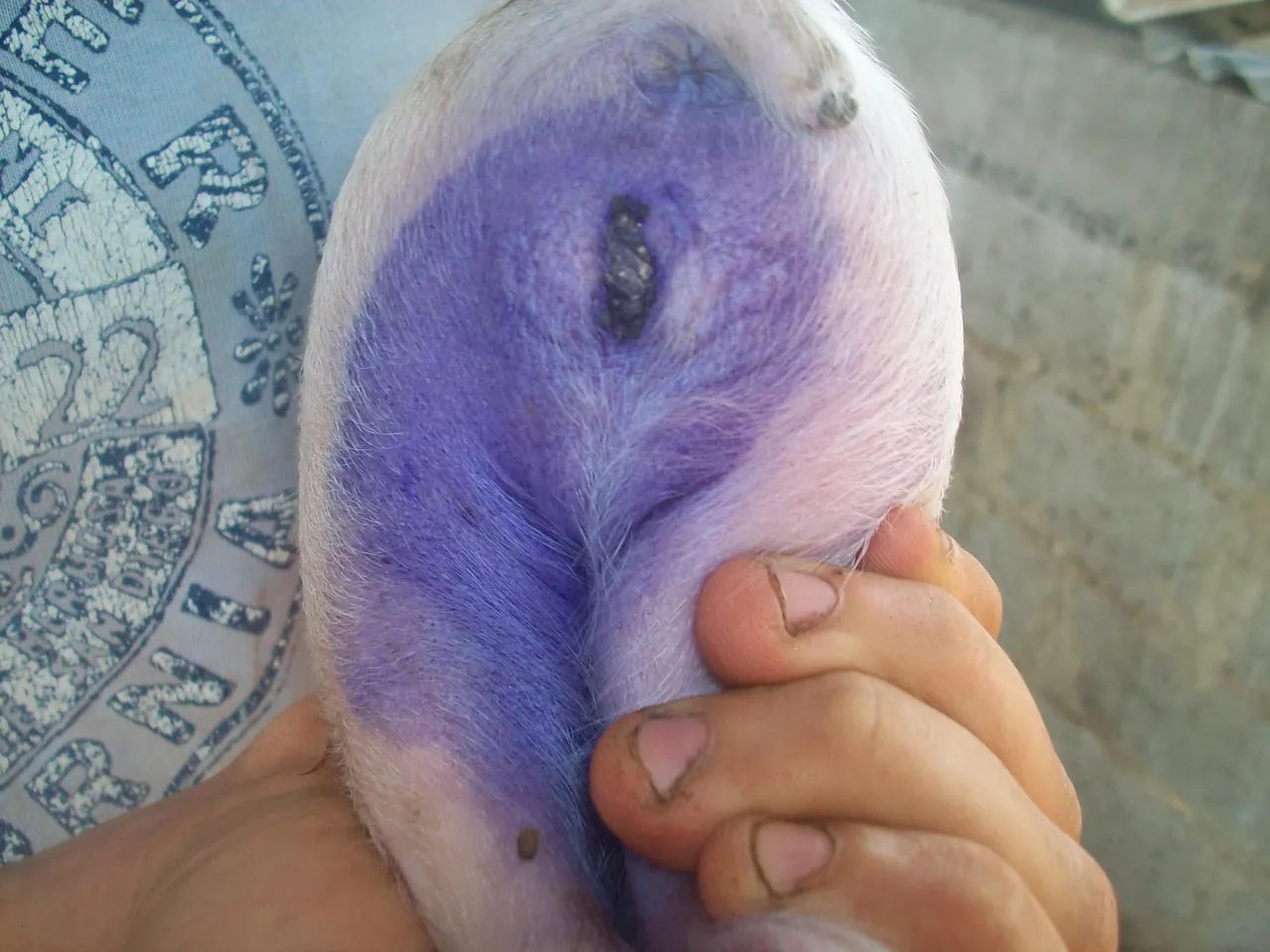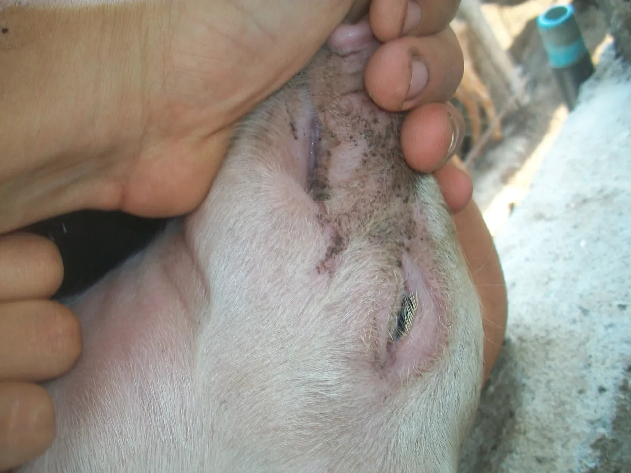 - Una vez extraído todo, se deba abierta la herida para que drene todo el líquido y antes de soltar al cerdo, se le coloca el iodo o algún antiséptico, para eliminar las bacterias y evitar que se sienten moscas a poner larvas.