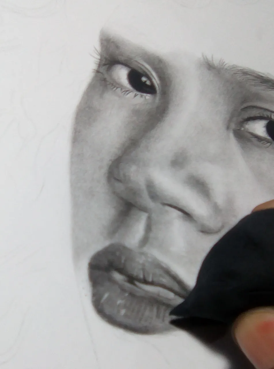 with charcoal, pencil 4B and 6B i made the lips, then i made the glitters with the moldable eraser, as well as some glitter on the face.
