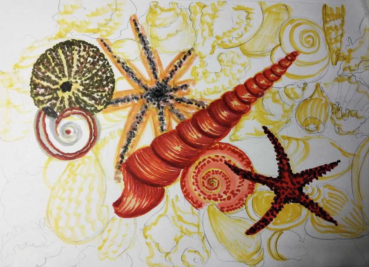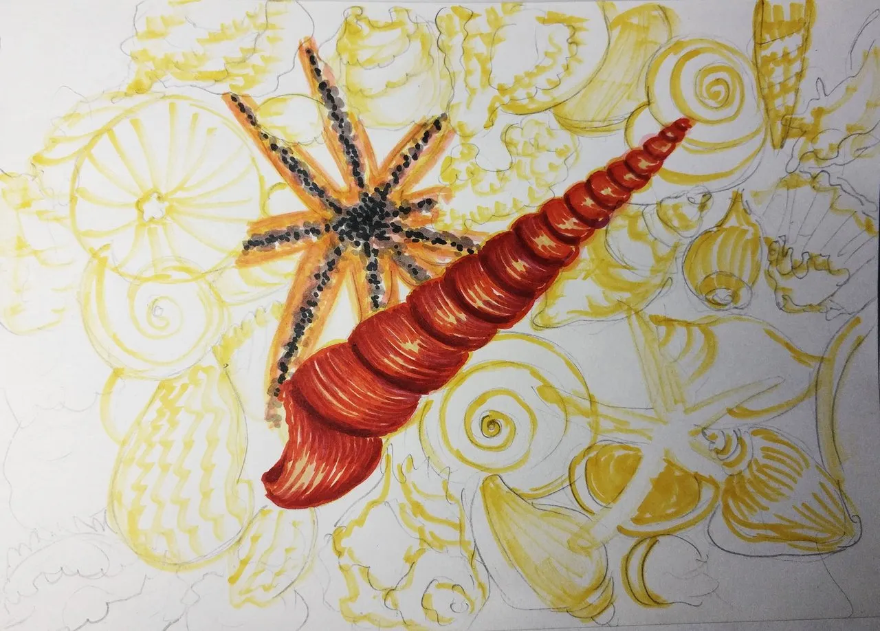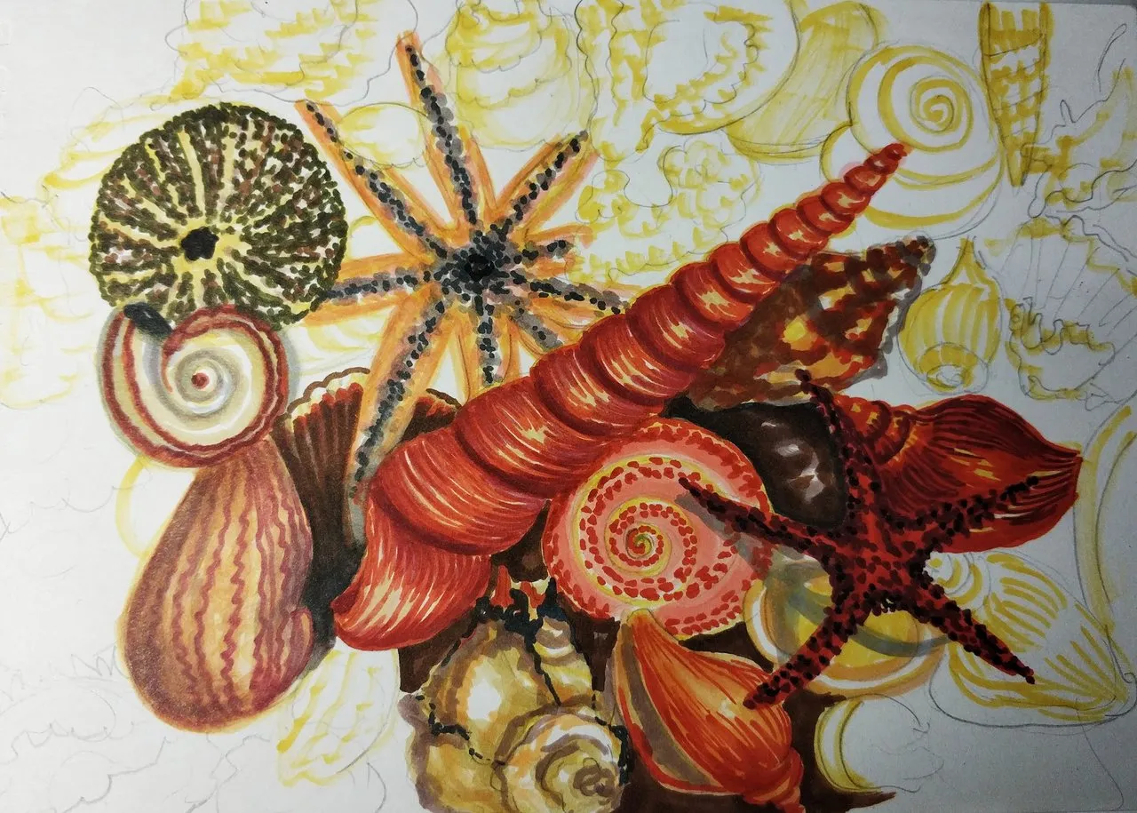 When applying the color, I moved from the center of the picture to the periphery. However, I tried to detail the whole picture for greater realism. The areas between the shells (where the earth is) I painted over with a brown marker, greatly sealing the shadows directly under the shells themselves.