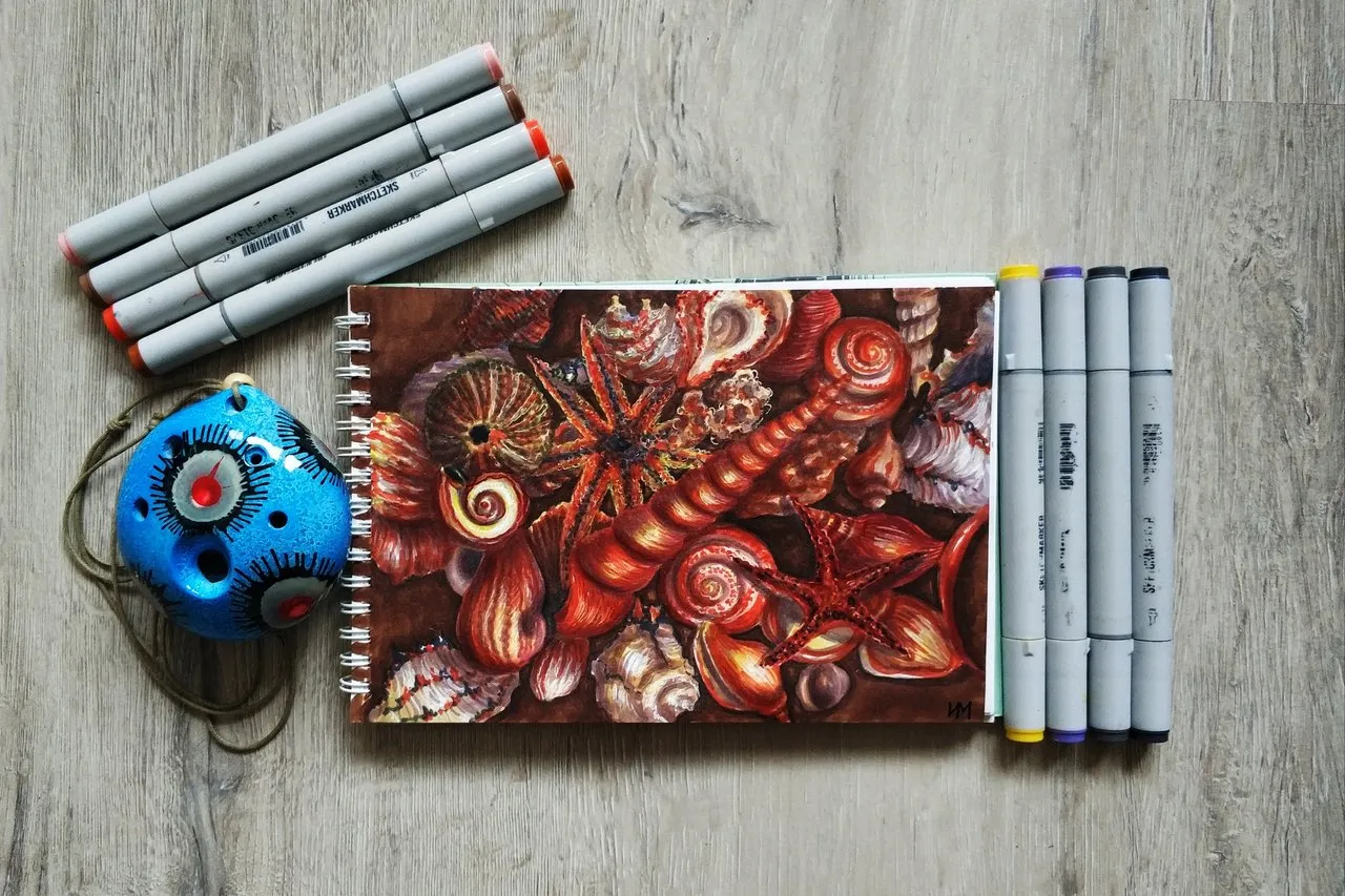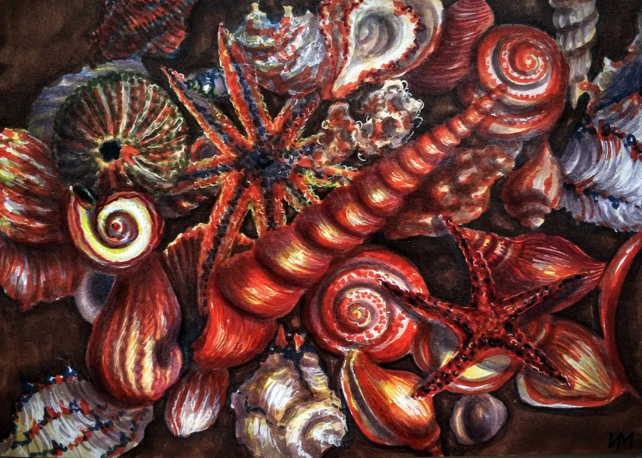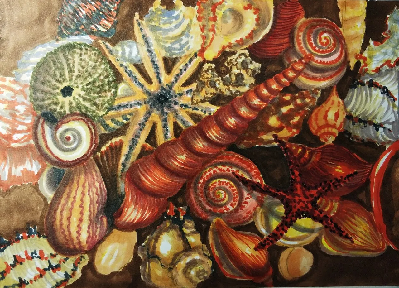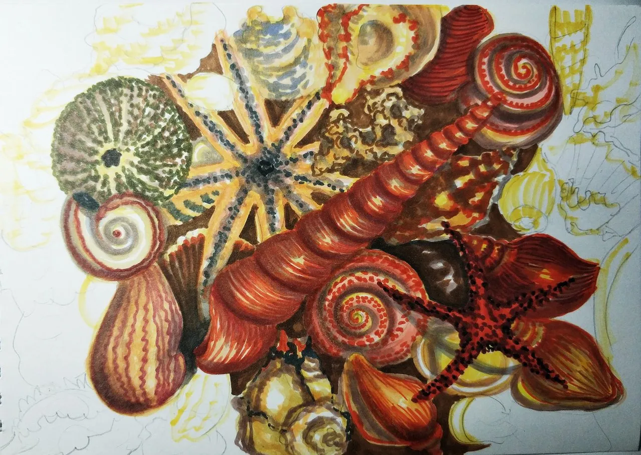 When applying the color, I moved from the center of the picture to the periphery. However, I tried to detail the whole picture for greater realism. The areas between the shells (where the earth is) I painted over with a brown marker, greatly sealing the shadows directly under the shells themselves.