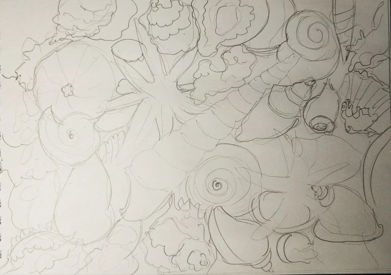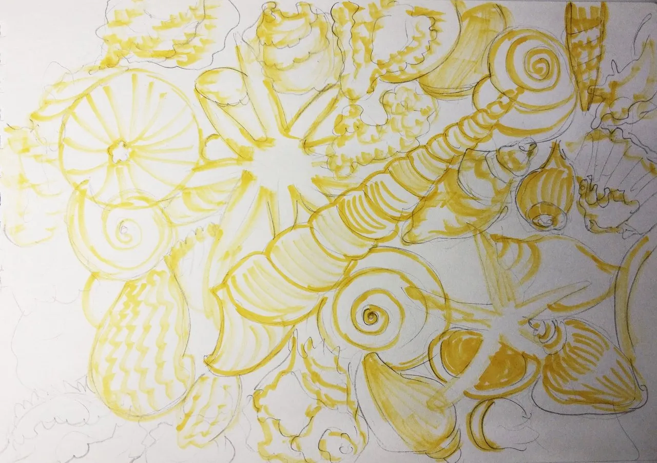 With a yellow marker I fill out the contours of the shells and their most sunlit spots.
