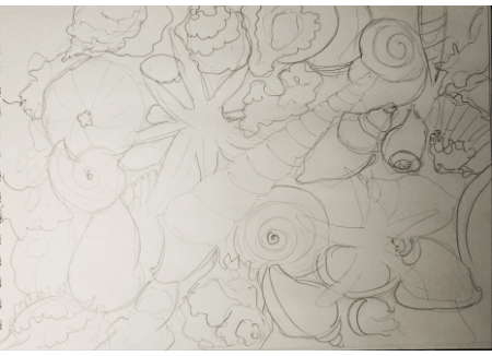 Has started to detailing. I drew a shell and a star in the center of the picture. The whole picture will be in orange shades, so I will stick to the main orange color.