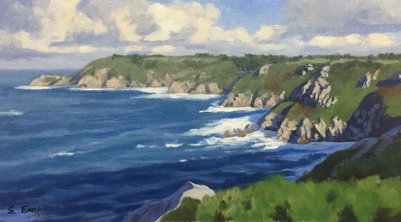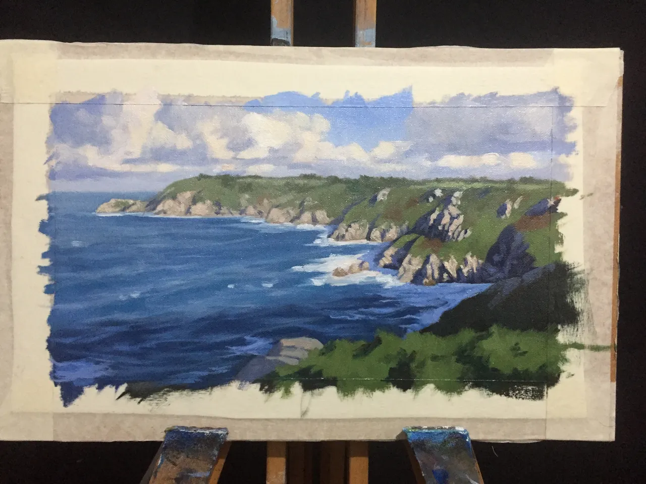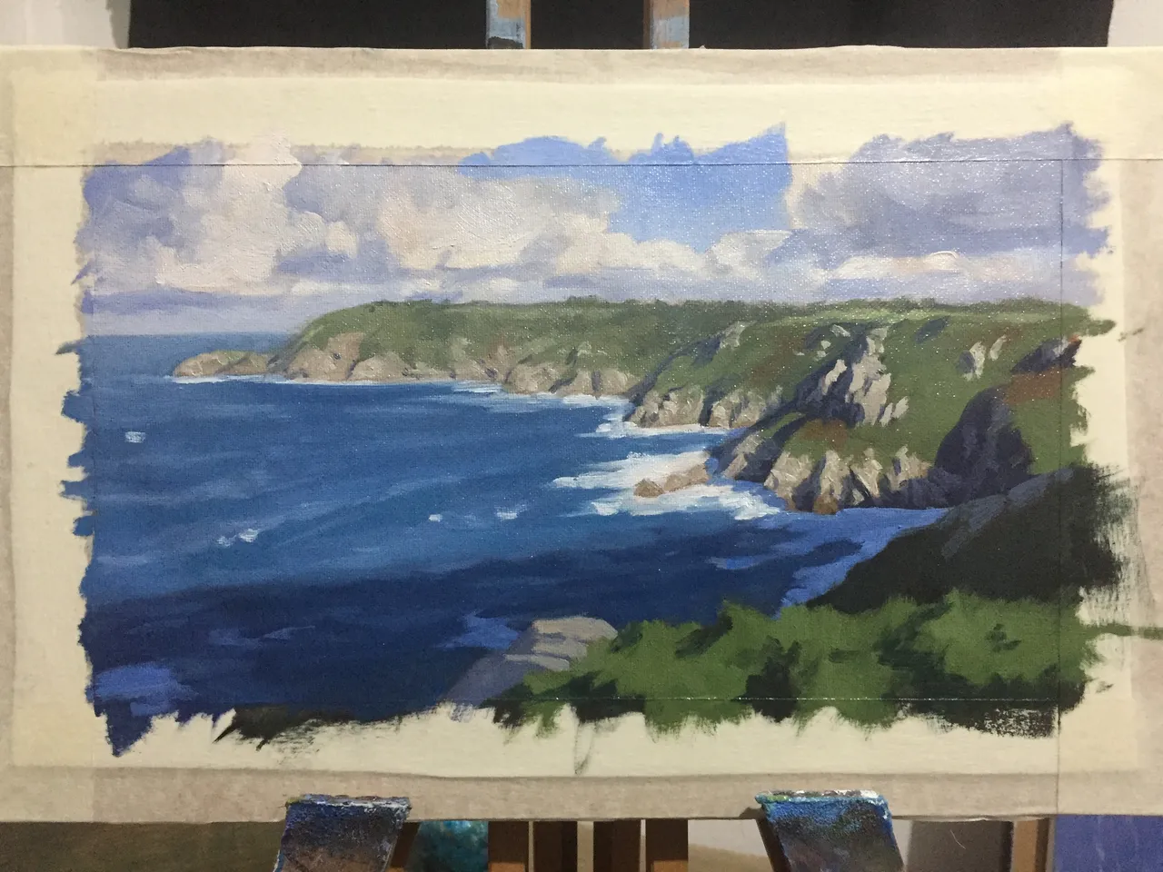 A couple of days ago I started a small oil painting of the view from Icart Point located on the island of Guernsey, UK. I uploaded a post on Steemit to show the process of starting the painting and blocking it in. Here is the Steemit link: