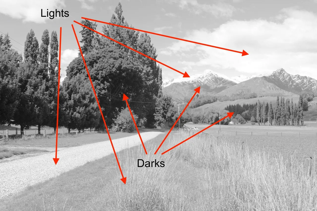 The concept of light and dark values is best illustrated when we switch our reference photos from colour to black and white. The shadows of the trees are the darkest values but as we look at the shadows in the distance such as the trees in the mid ground and the mountains in the distance, the shadows become lighter.