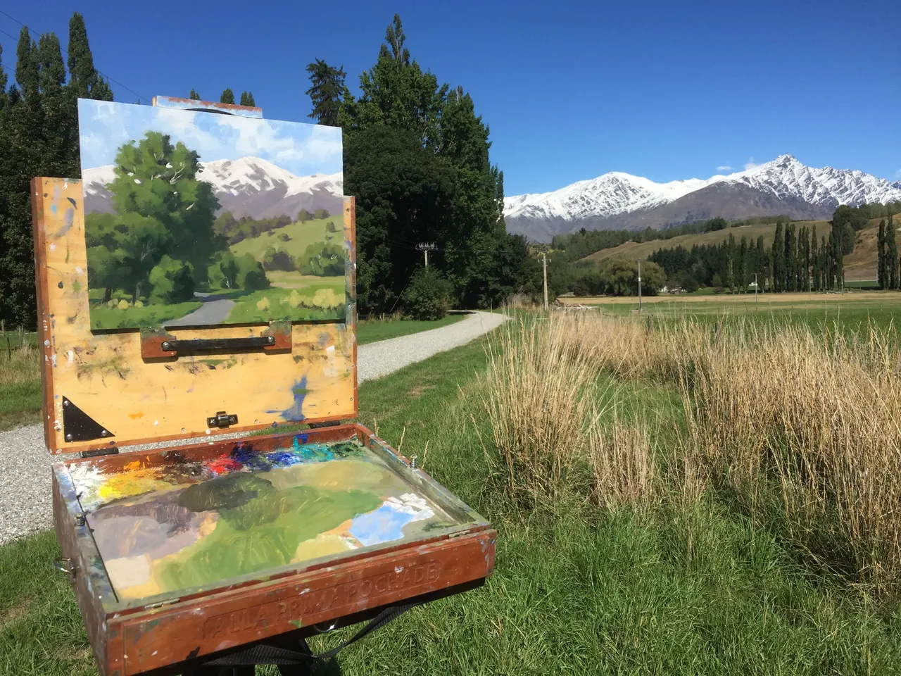 I came here to paint in February the day after we'd had a cold spell of weather that left snow on the mountains. Given that New Zealand is in the southern hemisphere the seasons are reversed and so February is a summer month. Anyway I thought it would make for an interesting painting with trees and fields juxtaposed against some snowy mountains.