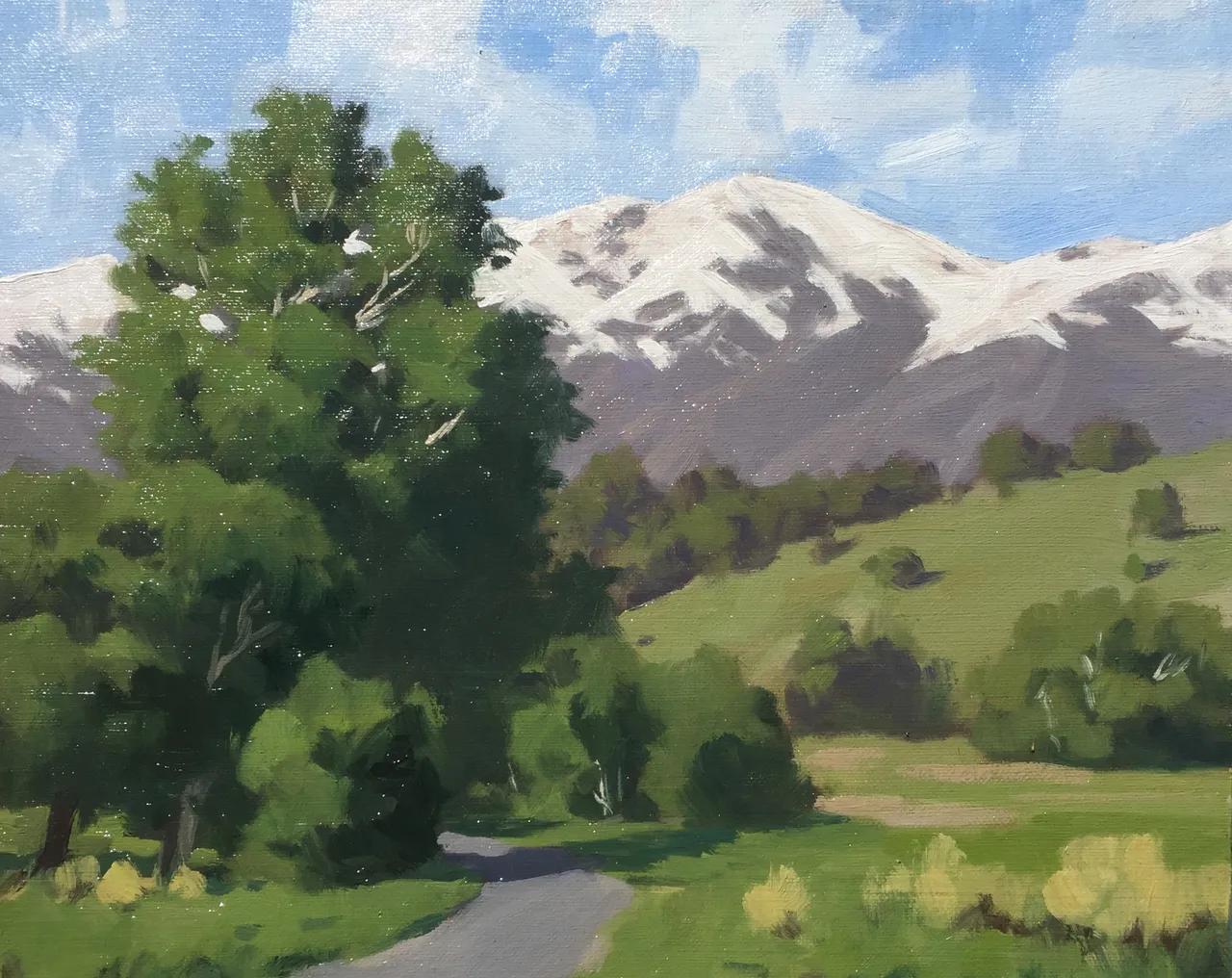 I have just recently finished a studio painting which features a stand of poplar and sycamore trees with a backdrop of farmland and mountains. I got the inspiration to paint this scene after I went painting outdoors (known as plein air painting) the day after we'd had an unusual spell of cold weather that left snow on the mountains.