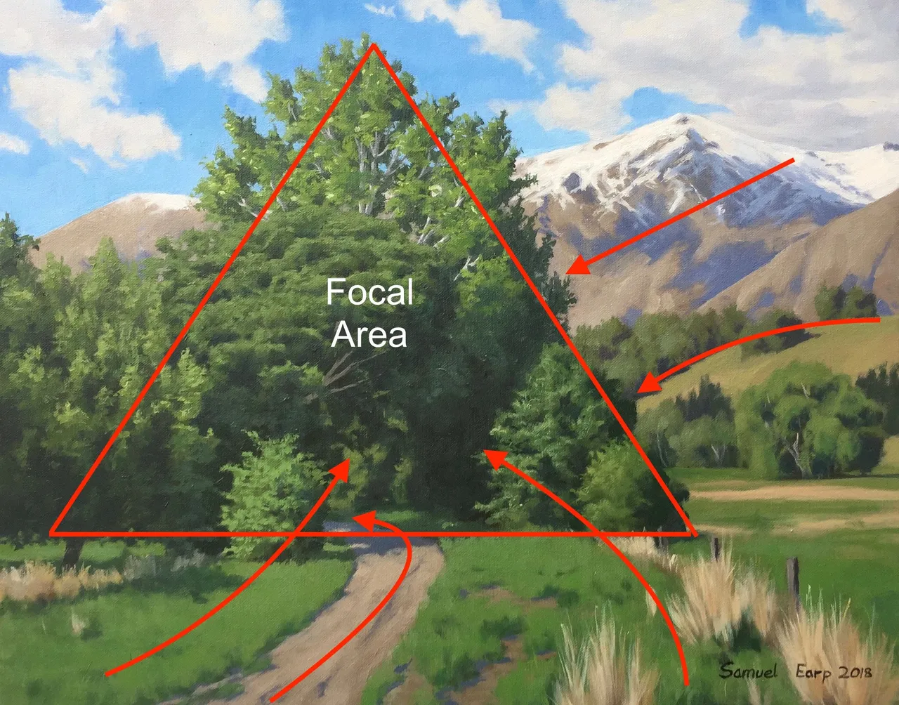 This composition in this painting is known as a pyramid or triangle composition and it suggests permanence and stability because of its structure, perfect for trees. I have placed the stand of trees to the left of the centre, remember that you should never have your focal area in the middle of the painting as it's predictable and forms a displeasing static.