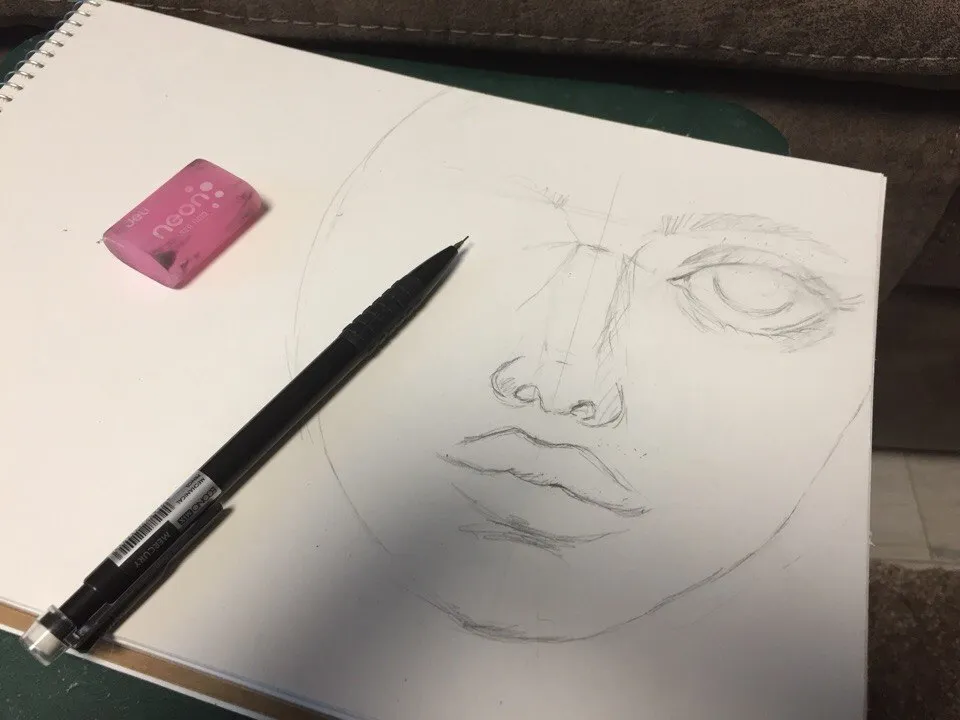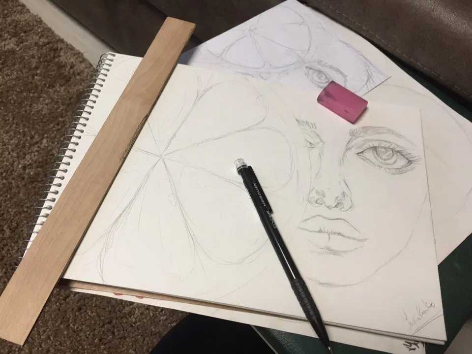 Material for the sketch: pencil, mechanical, I like that it does not need to be undermined. eraser, thanks to him I can correct any errors.
