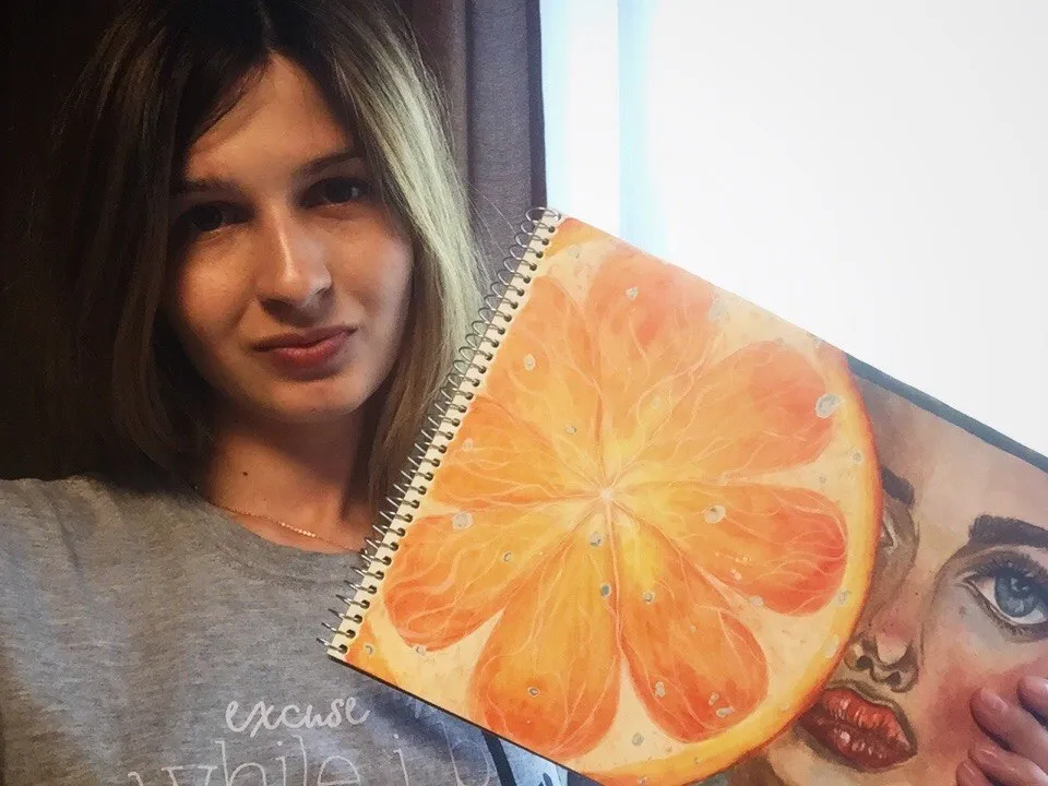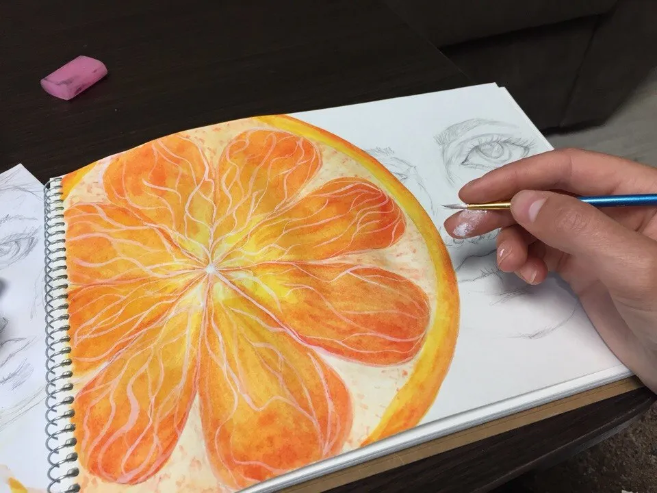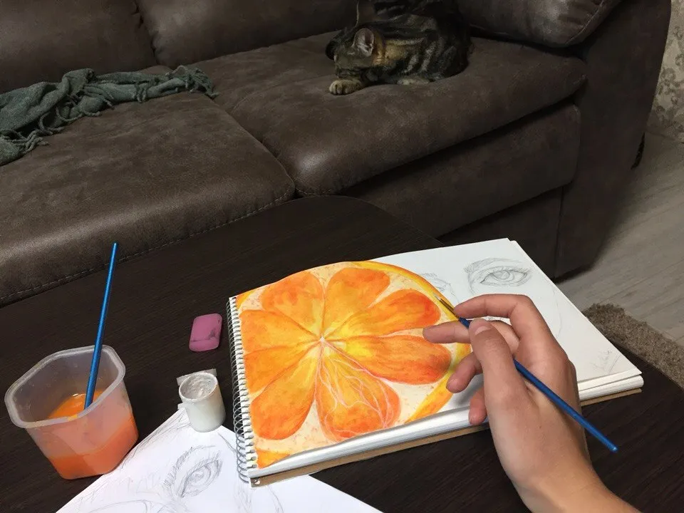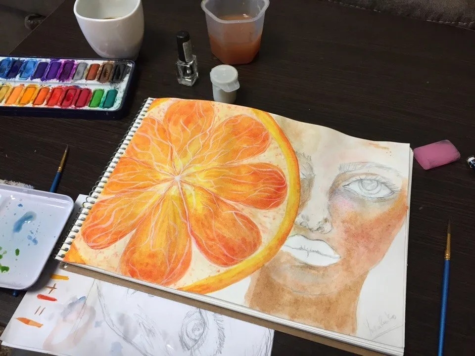 Most often in the second stage I paint the background, but in this art for the background there is almost no place, so I will paint it in the end. This time an unusual art. This is a bright and juicy art) In order to paint an orange I used several warm water colors. At each stage the color is darker and darker, only it remains warm.