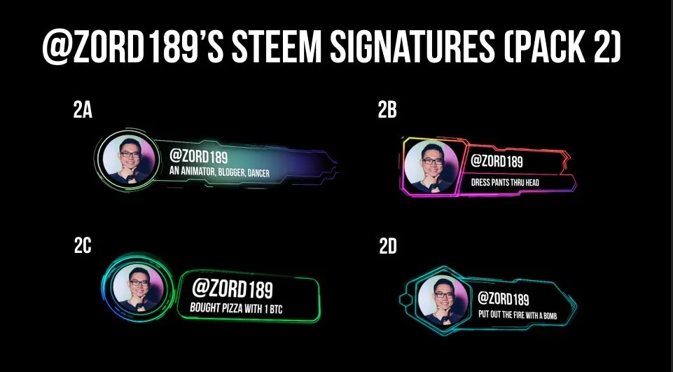 Fresh from the oven, this is my new series of Steem signatures that you can get. I've created this series to suit a different style and taste of Steemians because I know that not everyone likes the same stuff. This, on the other hand, is a little more futuristic and digital which also suits the theme 'blockchain' and 'crypto'. There are four types to choose from and you can customize to your liking. Below are some of the orders that I've done so far!