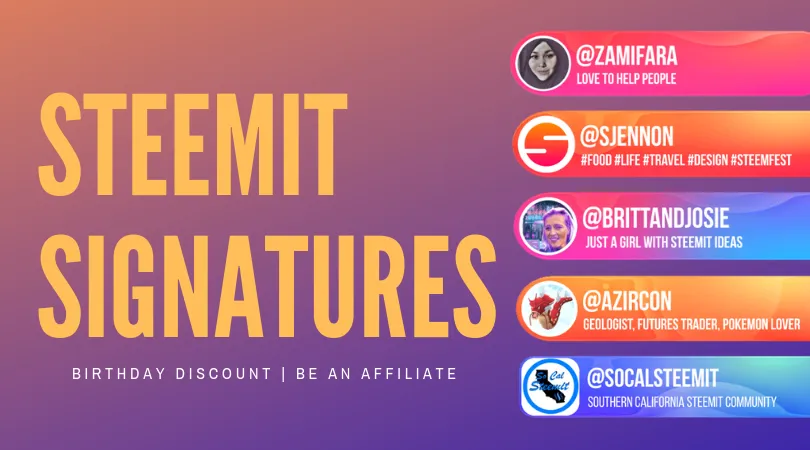 A huge shoutout to all who've ordered from me. So far I have created 71 custom signatures for Steemians all over this blockchain and you can be the next one. Also, if it is your birthday month, you can get the Signatures for only 3 STEEM! Other than that, there's an affiliate bonus where you can collab with me if you want to reward Steemians that participate in your contest a signature. More details below.