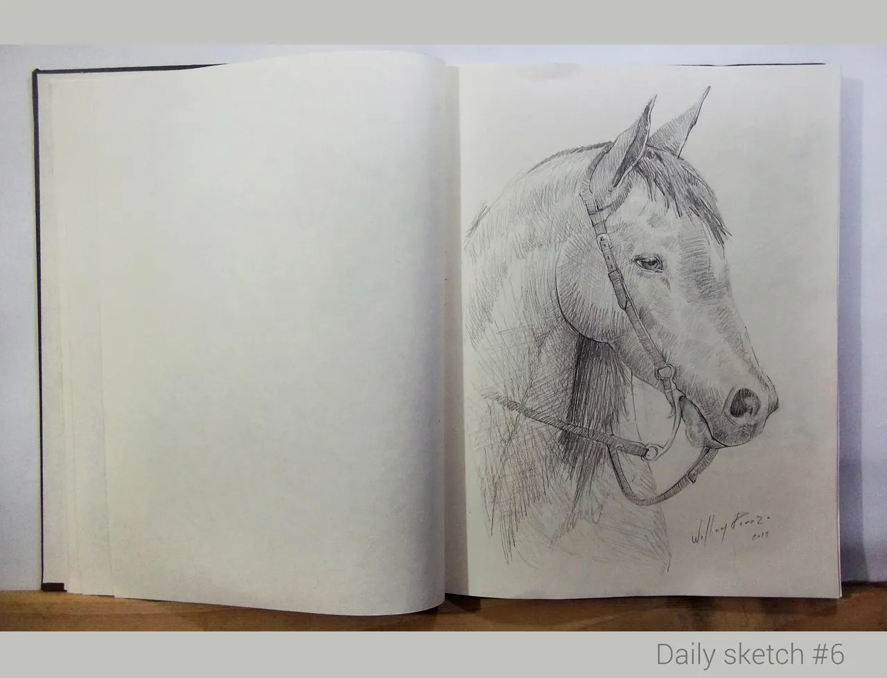 Hola steemians! aquí el dibujo numero 6 de mis Daily Sketch, en esta ocasión dibuje un caballo aunque realmente no me gusta mucho hacerlos, esto porque siento que es como dibujar una de las cosas mas comerciales que se hacen en el arte figurativo convencional, pesar de eso se que hay muy buenos trabajos referentes a caballos y artistas que los han representado muy bien en la historia con un objetivo más honesto que el puramente comercial, bueno sin mas que decir y antes de que se vuelva a ir la luz, aqui esta, un dibujo de un caballo que no le hace daño a nadie, que realice con lápiz de grafito tratando de trabajar los volúmenes por el medio de tramas y sin tanto difuminado.