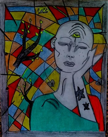 II. I used the shading technique with a medium drawing pencil, then a darker one to highlight what I most wanted and applied fluorescent highlighter in the third eye and the leaves of the tree of life.