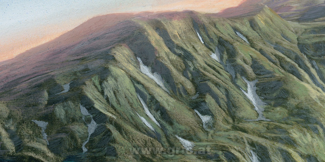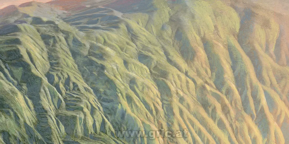 The concept of Nonplanetary Landscape was something I wanted to manifest with a series of at least 5 paintings, however, so far I only made two. My idea was to wrap the surface of a planet to something different than a sphere, in case of Nonplanetary Landscape II it's a torus. To create my reference for this painting I used the topology and textures from Google Earth and wrapped it in 3D-software into a torus.