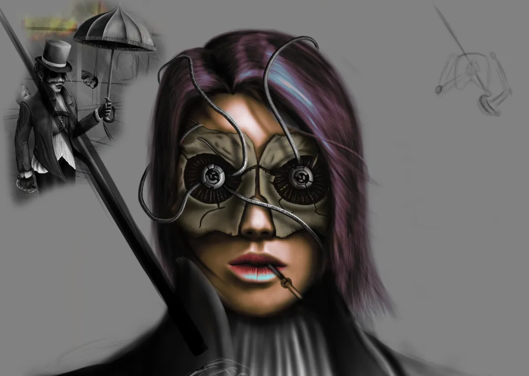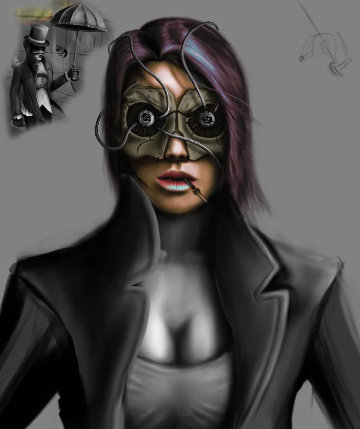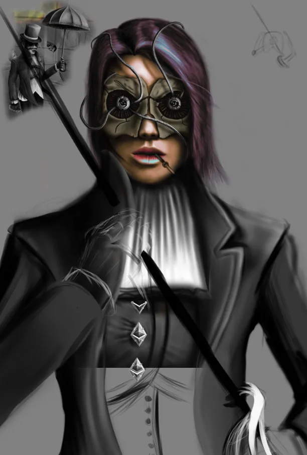 This is the progress that I have with this sexy lady. testing out colors, and costume designs. I've ended up with 2 possible solutions, not final... as always. But this is my first idea, standing by the second painting (on the left corner of the painting) that is shown in the screenshot. I'm messing around with it, trying to pose it right and to look as cool, intimidating and sexy as possible and keeping the Victorian style of classic clothing at the same time.