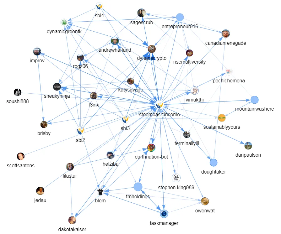 Unfortunately, most of the tightly bound clusters of members have 1 or 2 'leader' accounts that have a high number of shares from sponsoring the rest of the cluster, and then the rest all have a few shares but aren't big enough to come out as major players in the pool of 1500. That means that the enhanced votes graph is a lot less interesting as it used to be, since the leaders of different clusters are not closely bound to each other. Instead it looks like a lot of loosely related accounts which don't have a lot of connections other than their link to @steembasicincome.