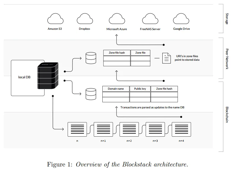 The Blockstack architecture has three layers: blockchain, peer network, and storage. See the graphic below.