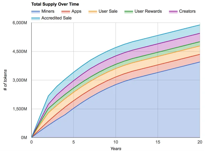 The mining system starts by releasing 8,000 new tokens per block. The rate slows down by 500 per year until it reaches 2,000 tokens. It continues to give 2,000 per block forever. Inflation is roughly 2% after year 13.