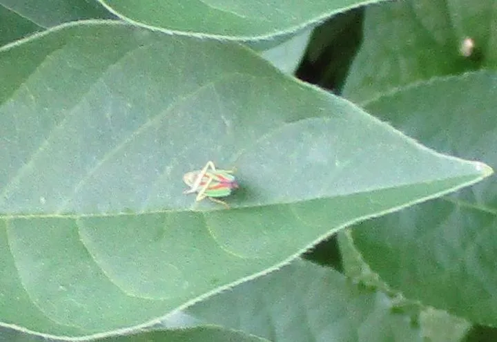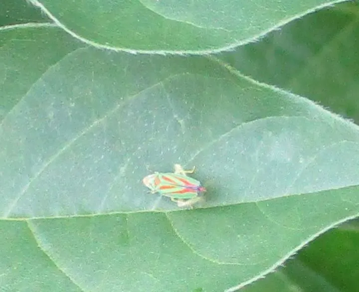 These photos aren't very good because this leafhopper was far away and so small; 3/8 of an inch long. And they hop, leap and fly away so fast. A member of the Cicadellidae family and native to North America, these colorful insects can do a significant amount of damage to the leaves of blackberry and raspberry bushes, and ornamental plants. Their piercing mouth parts suck the juices from the leaves.