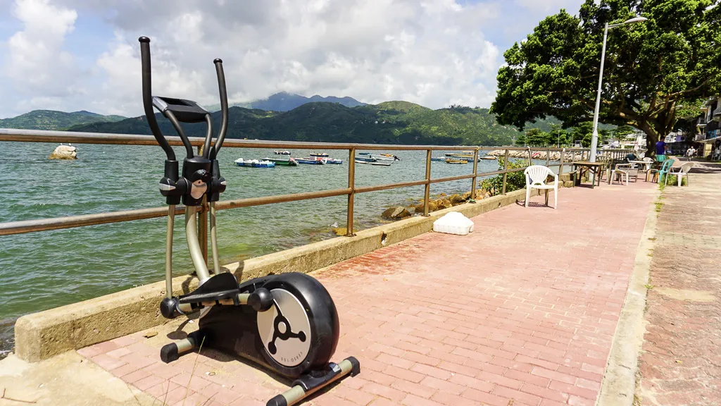 Houses are built beside the coast. What an enjoyable sleeping with the sound of waves! On the promenade, people are jogging, cycling, walking dogs and enjoying the sun. We can see chairs, tables, salted fishes and even an elliptical trainer lol.