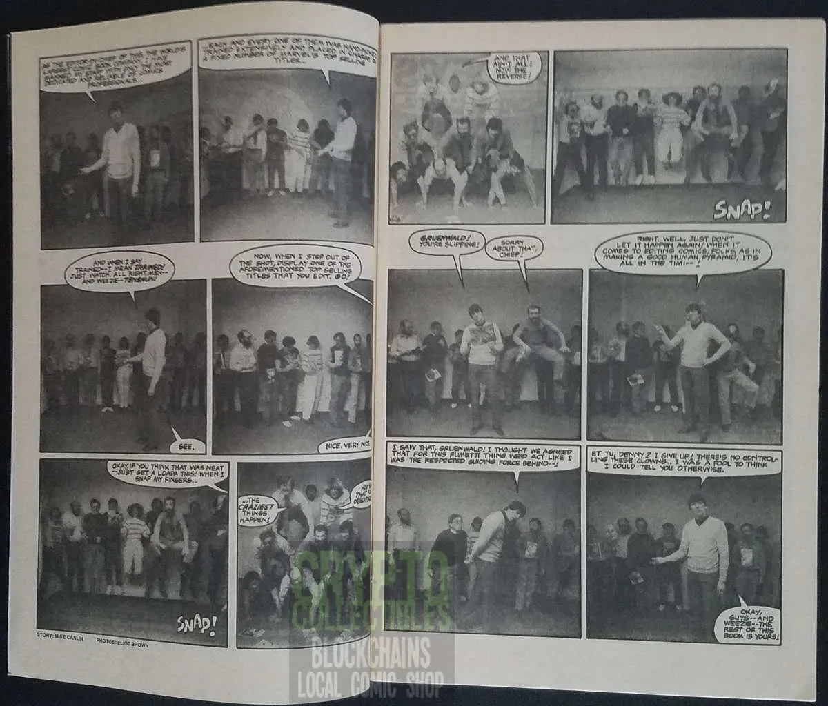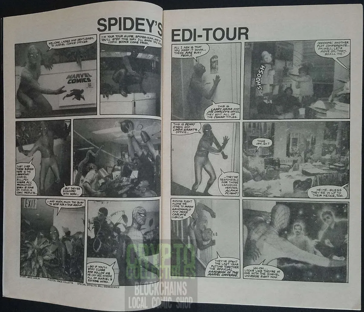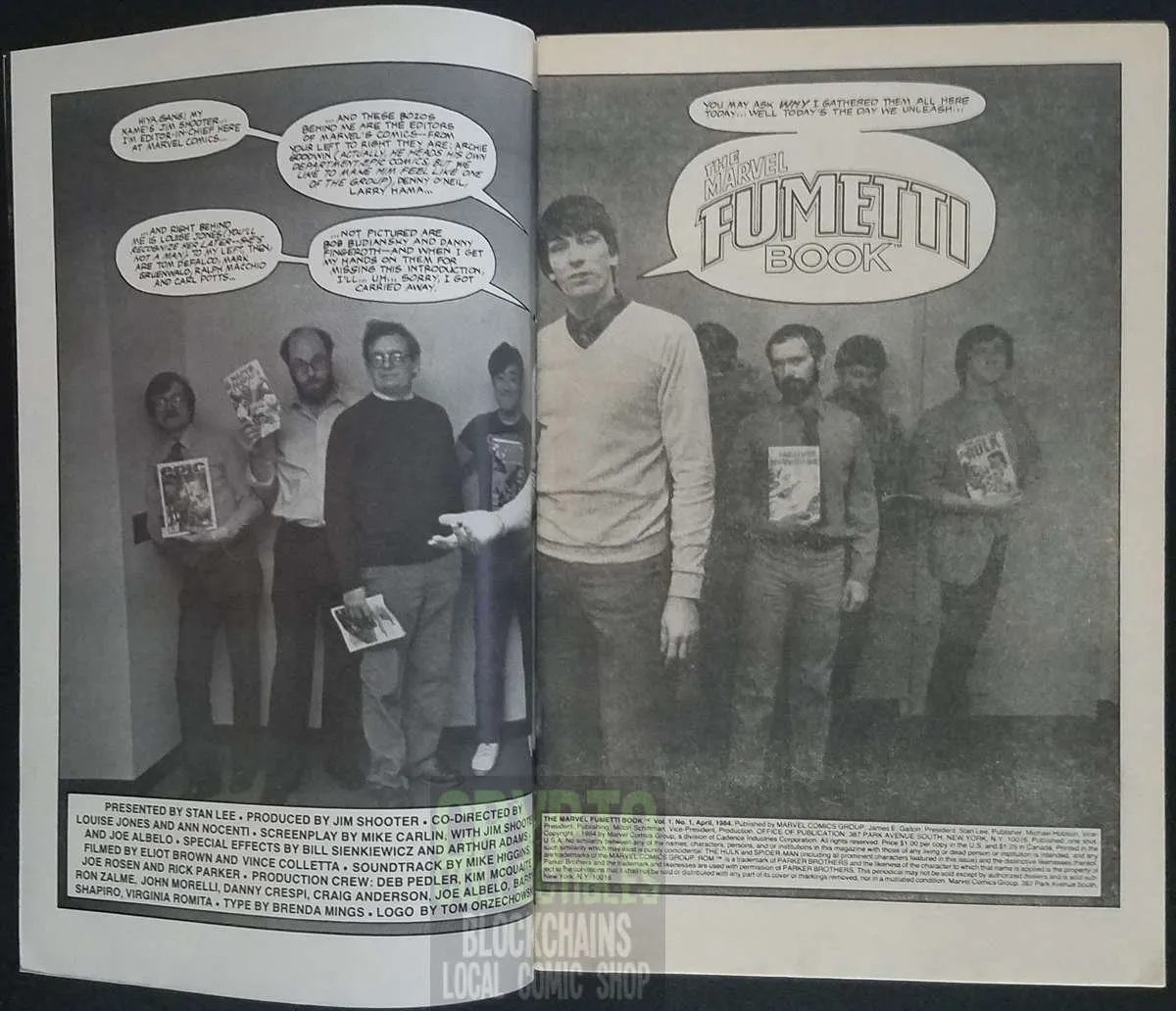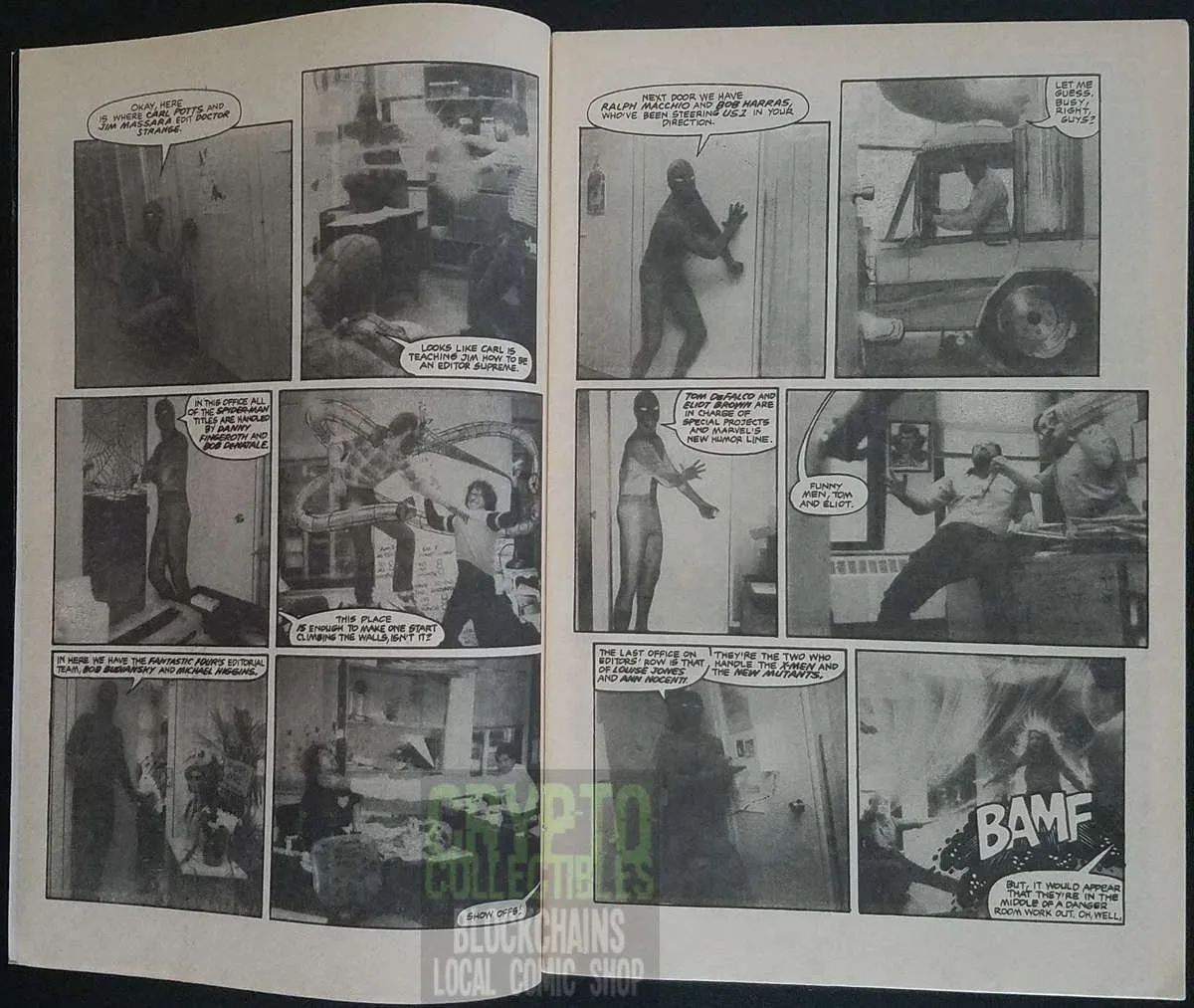 Fumetti is the touching up of a photograph with actual art. Writen by Joe Albelo, Mike Carlin, Peter David, Danny Fingeroth, Bill Mantlo, and Jim Shooter, pencils by Eliot Brown and Vince Colletta, inks by Art Adams and Bill Sienkiewicz.