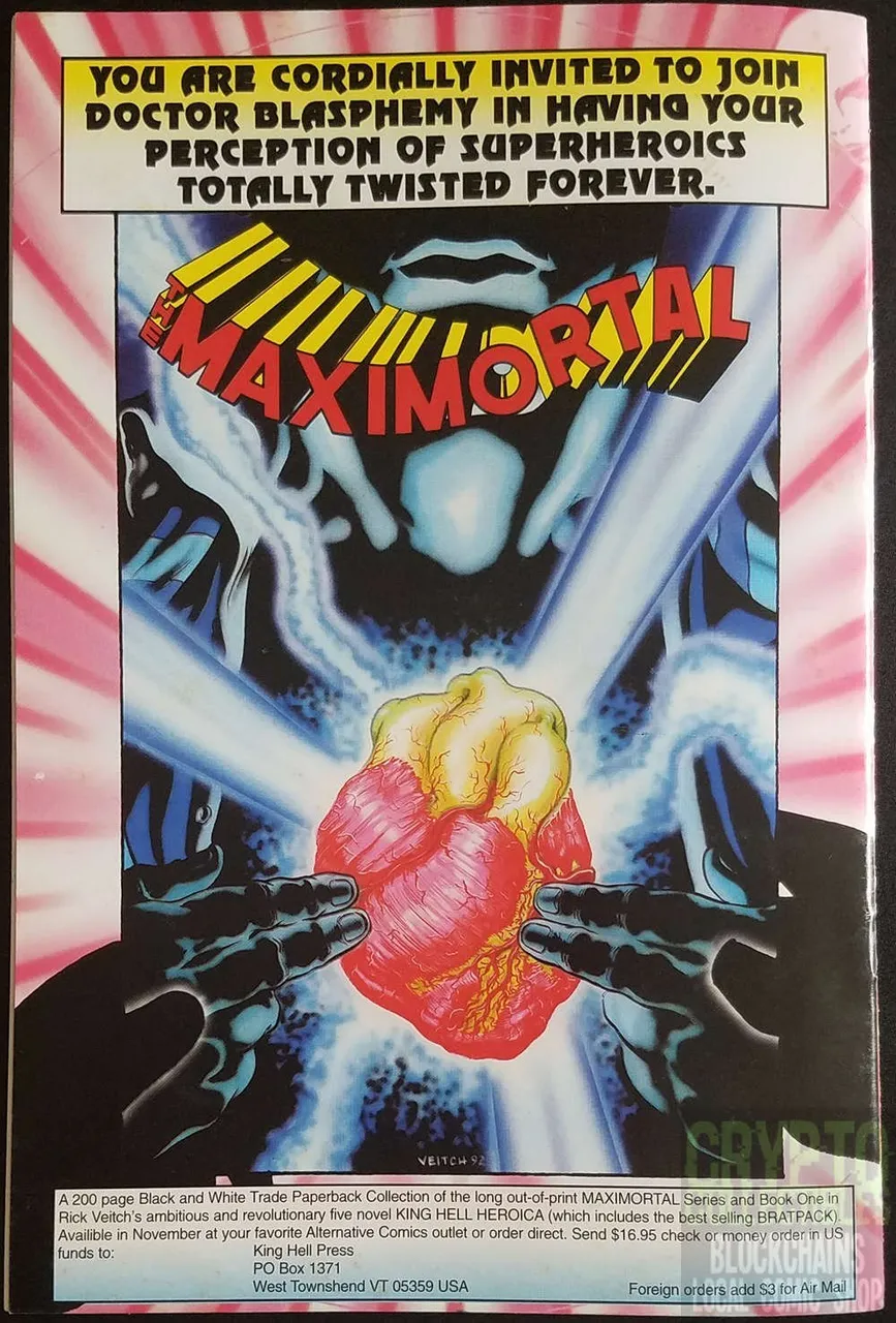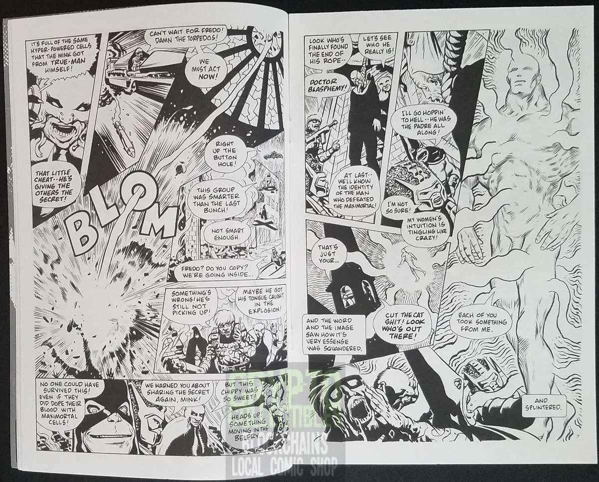 At the end of the world, the Maximortal and his old nemesis Doctor Blasphemy face off in one final game of wits. Written and drawn by Rick Veitch