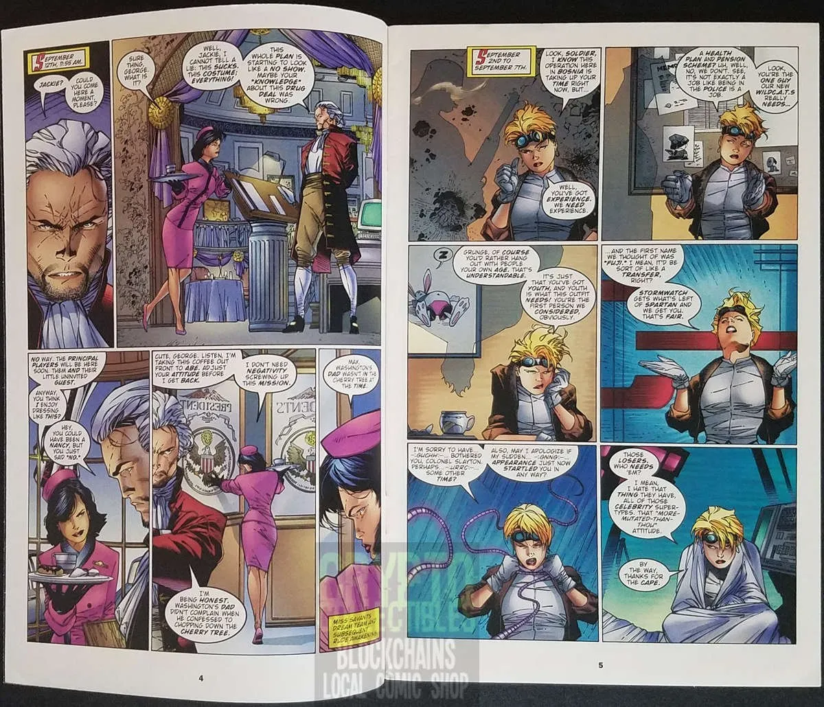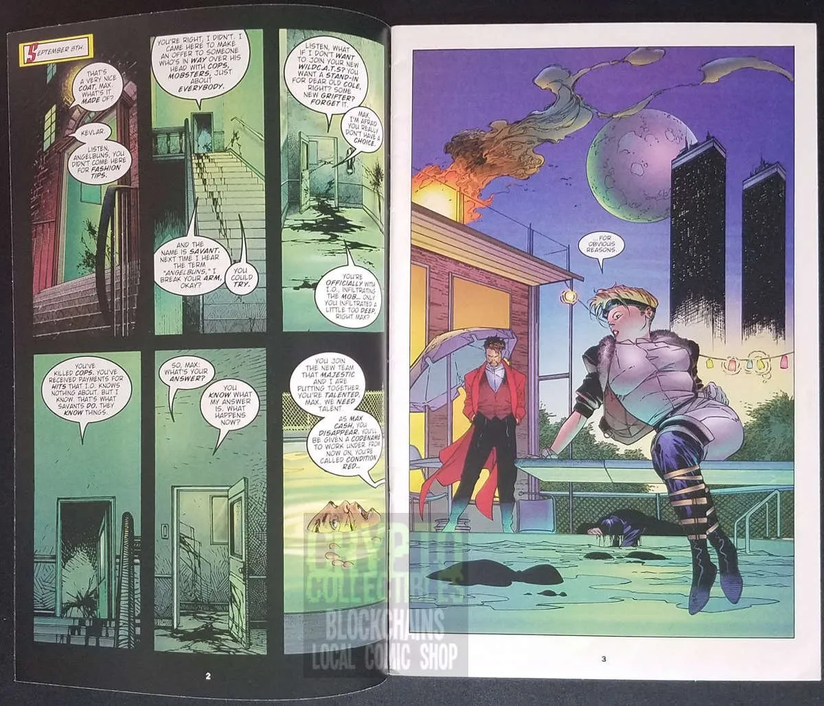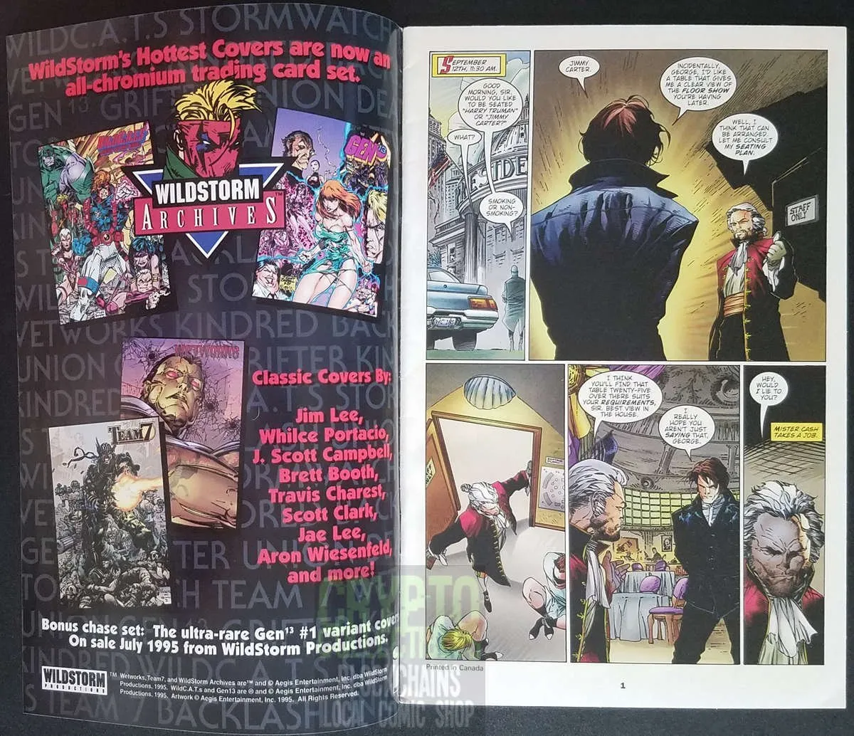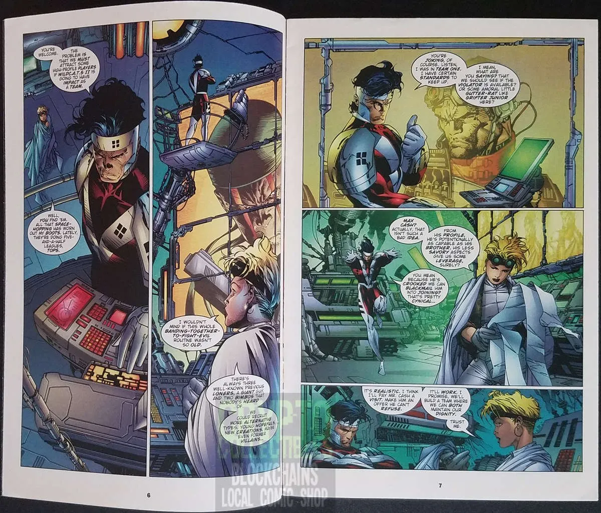 The original team is believed dead, lost in a final battle to save the planet from destruction. In honor of their sacrifice, Savant forges a new team of WildC.A.T.s. Consisting of the super-powerful Mister Majestic, Grifter's gun-toting brother Max Cash (Condition Red), the super-intelligent Tao, and the cyborg powerhouse Maxine Manchester (Ladytron). Written by Alan Moore, drawn by Travis Charest and Troy Hubbs, cover by Jim Lee.