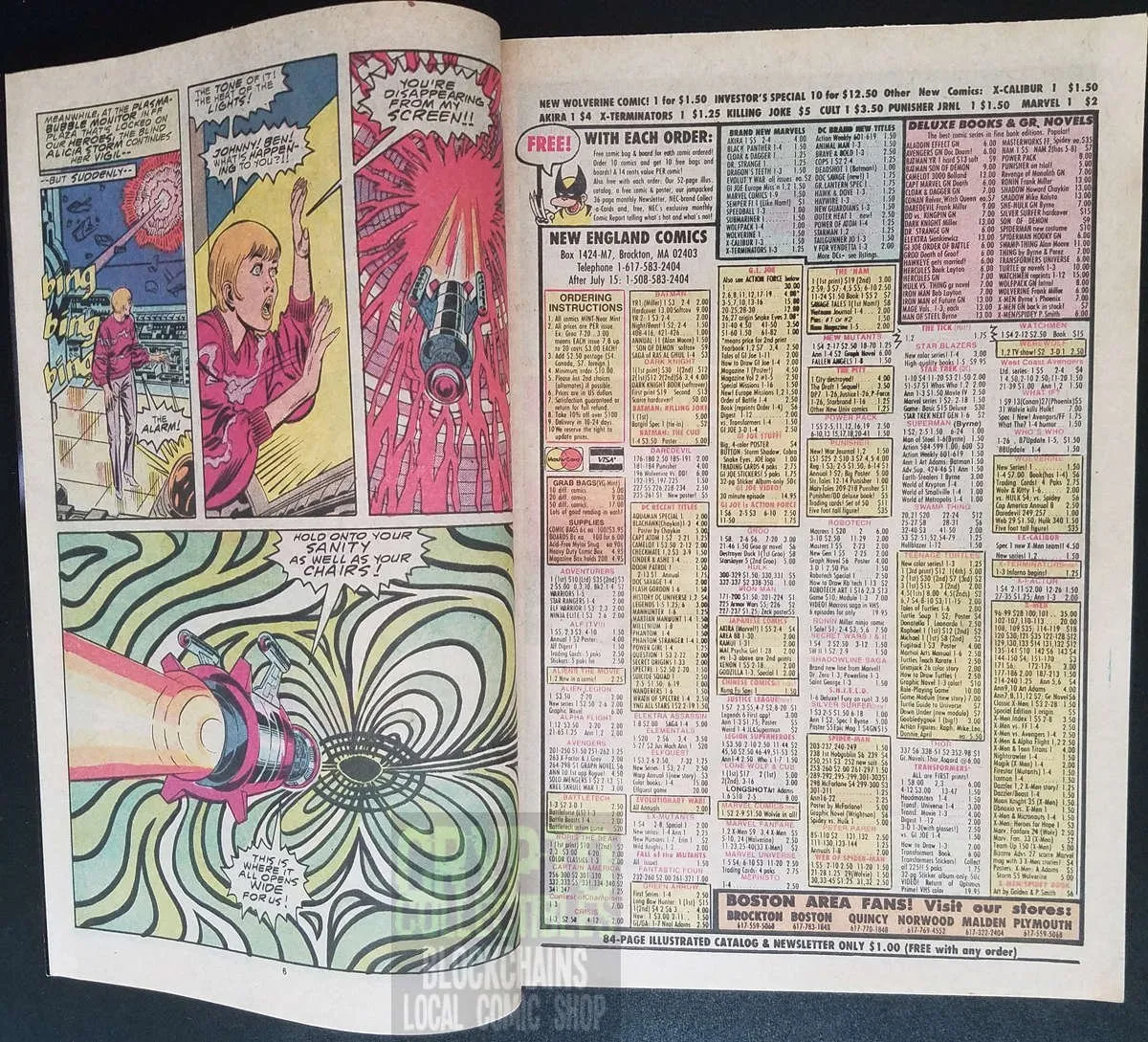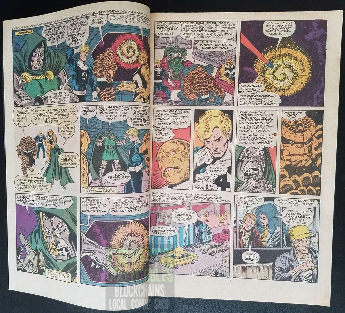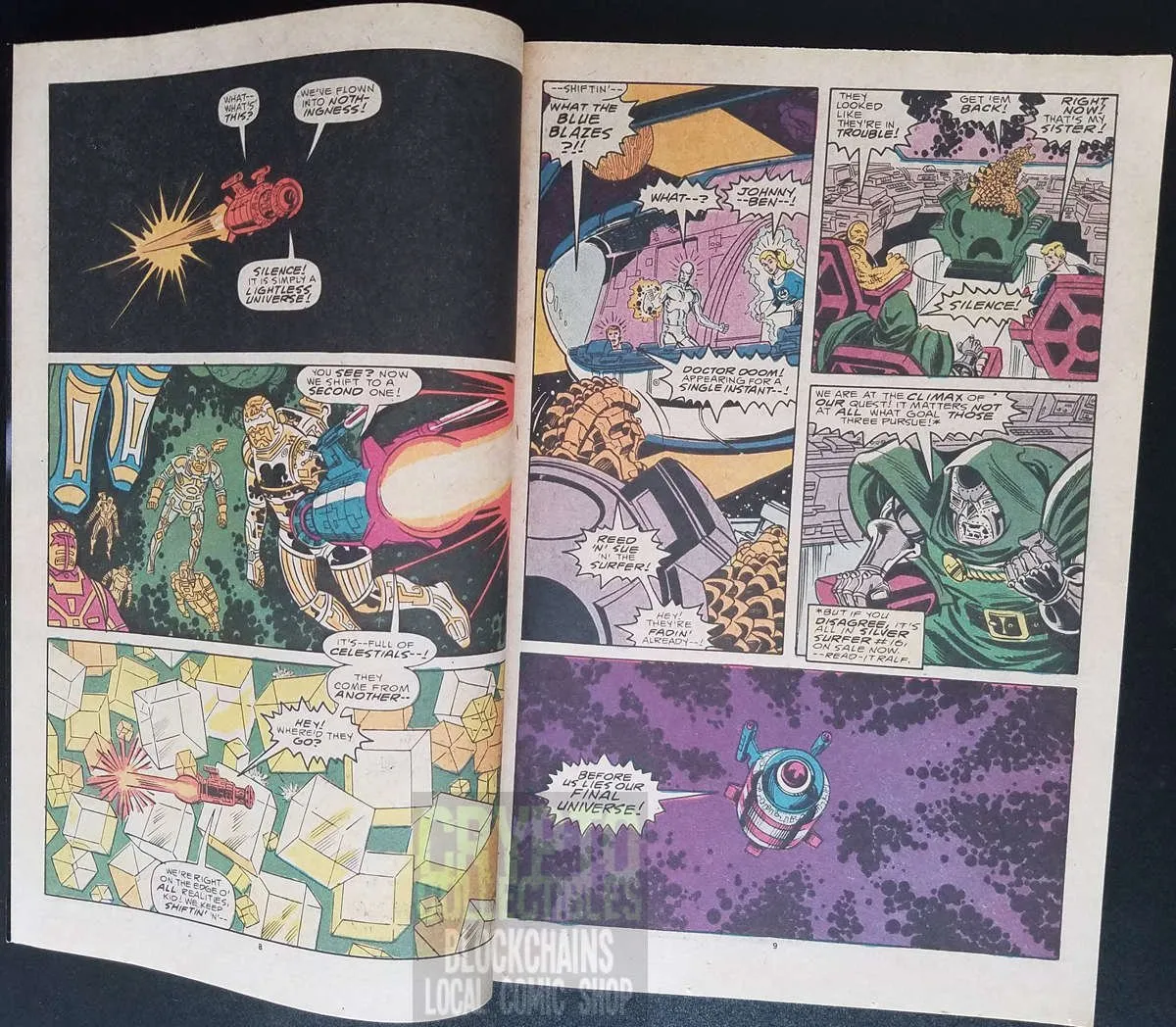 It's a complex cosmic-level story as the Fantastic Four, Beyonder, Doctor Doom, Kubik, Molecule Man, Shaper of Worlds, and Volcana sort out the meaning of the Beyonder's existence and extinction. Written by Steve Englehart, drawn by Keith Pollard and Joe Sinnott, cover by Ron Frenz and Joe Sinnott.