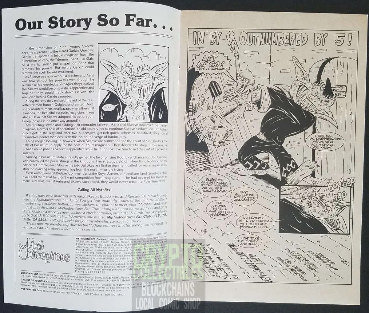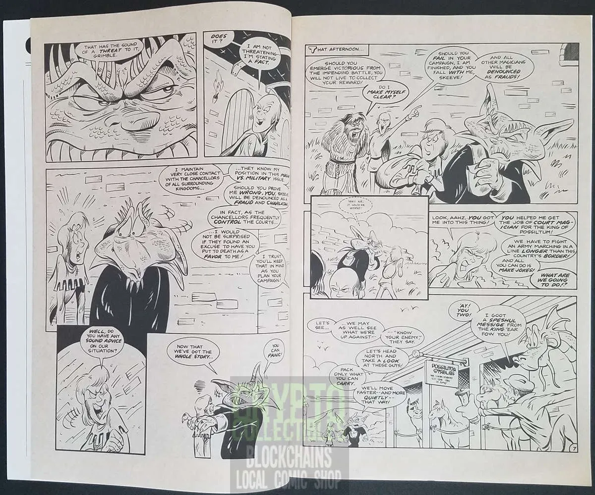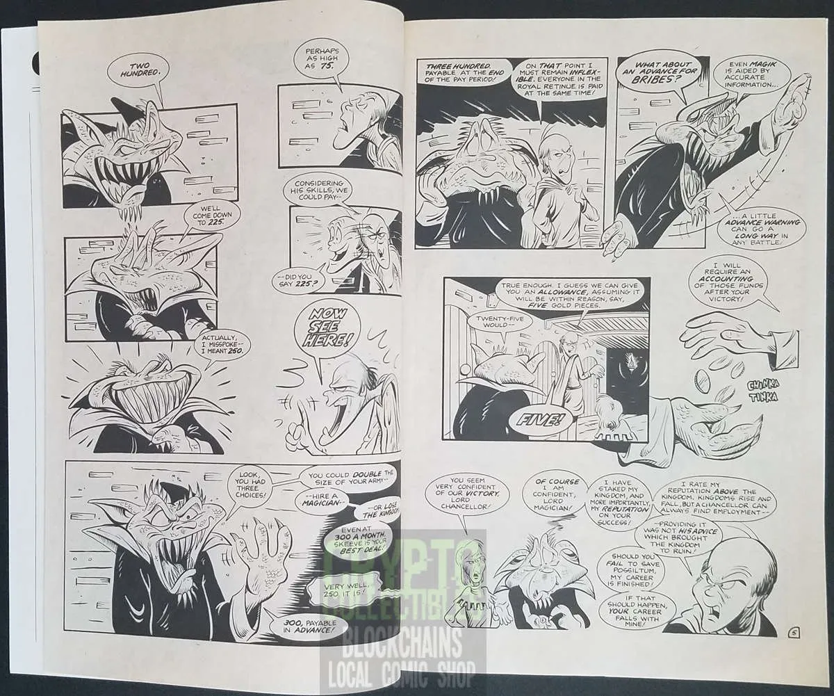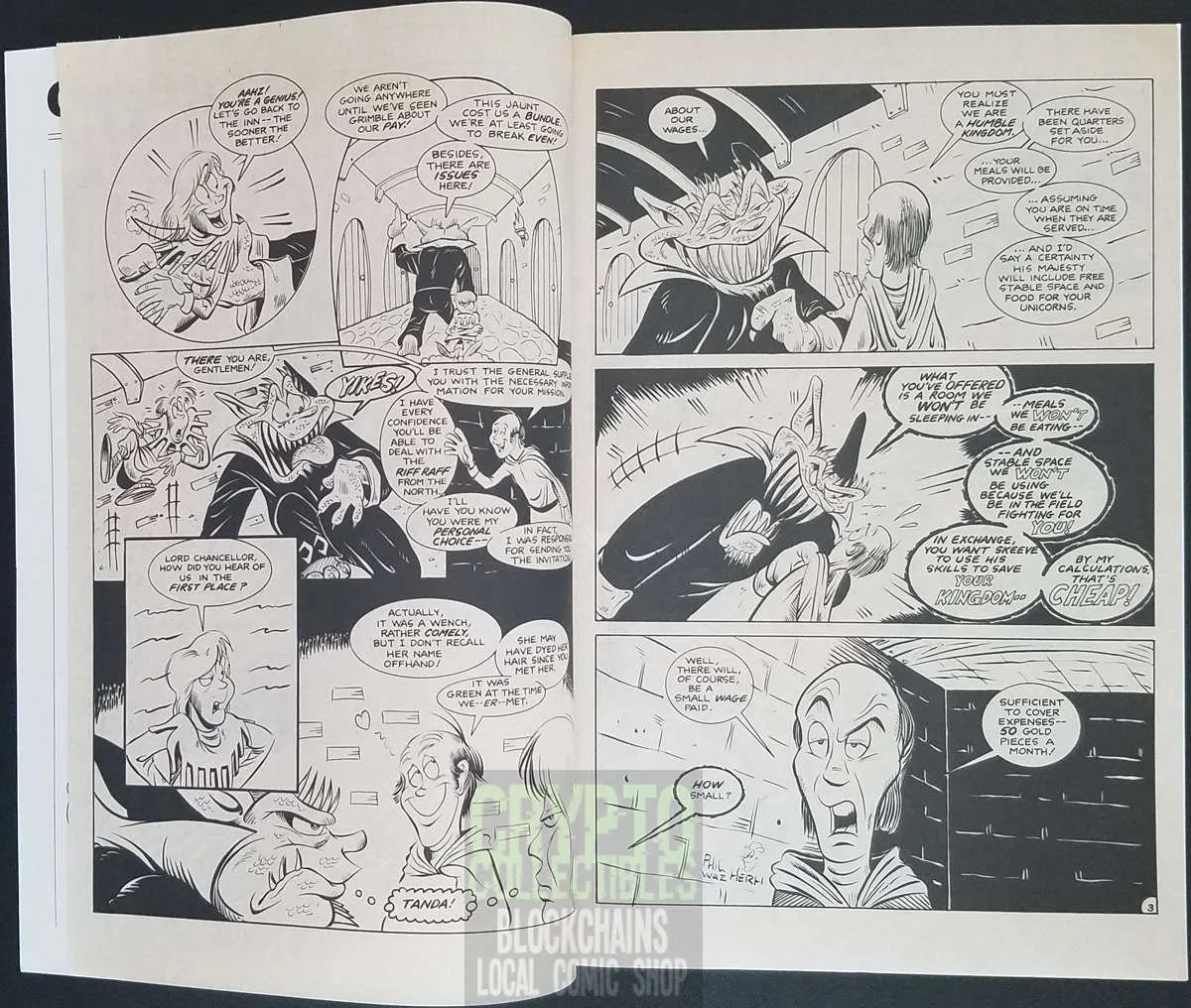 Once Skeeve and Aahz see the army they're up against, they're ready to give up...until an old friend drops by and offers up some alternatives. Written by Robert Asprin, Beth Mitchroney, and Ken Mitchroney, drawn by Ken Mitchroney.