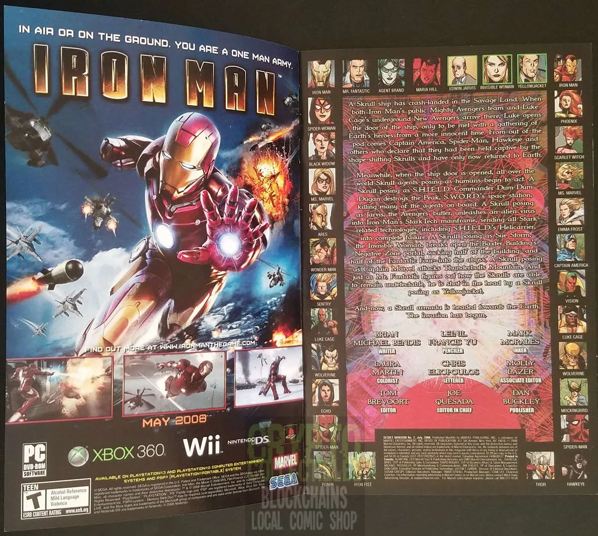 The world has turned upside down! The Skrulls have taken the Earth as part of their empire, the Avengers and Initiative are scattered...but there are two people who want some answers. Written by Brian Michael Bendis, drawn by Leinil Francis Yu.