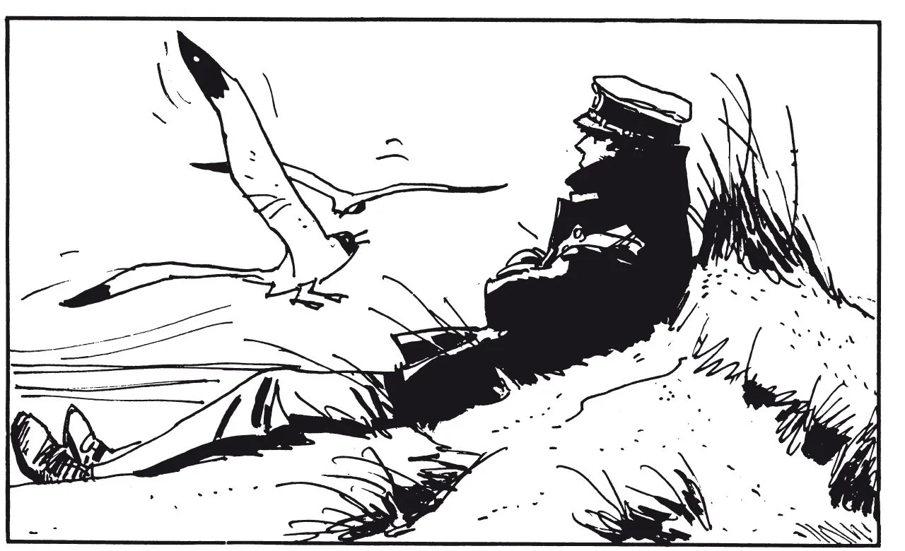 One of the cartoonists I have learned most from is Hugo Pratt. His stories are vague and dreamlike, and the drawings are marvellous - especially the albums he made in the seventies. One of the thing he was good at was minimizing the backgrounds without loosing the sense of location... that is... in his later works he seemed to get tired of drawing and more interested in his strange esoteric stories, but that is a bit besides the point here.