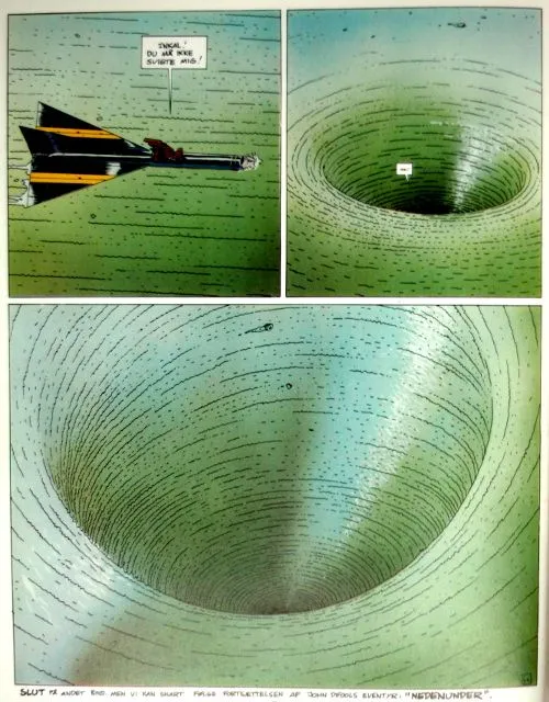 The album, the second in the series, ends in three large frames, slowly zooming out on a large maelstrom in a green acid-lake. The band of heroes is clinging to a floating spaceship that they have used as a raft, and we slowly loose sight of them. In the last large frame only the green acid vortex is seen.